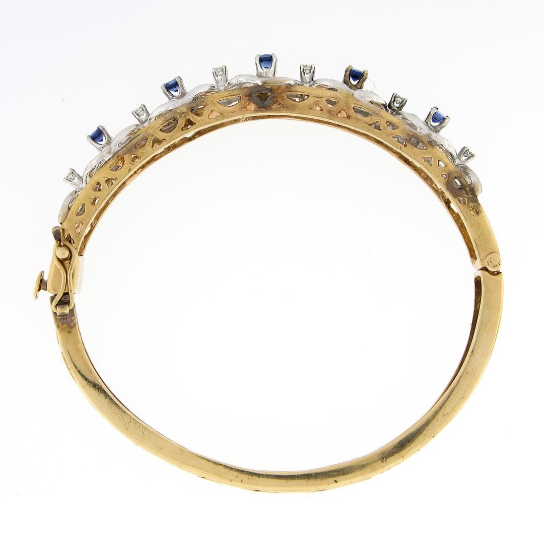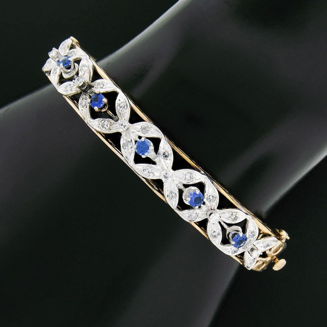 A vintage solid 14k two tone gold hinged bangle bracelet, with 5 round brilliant cut natrual sapphires (0.75ctw), and 30 old single cut natural diamonds (G/H - VS2/SI1 Clarity ; 0.75ctw). It weighs a total of 20.49 grams, measures 9.40mm wide, and measures 6.25 inches in length.