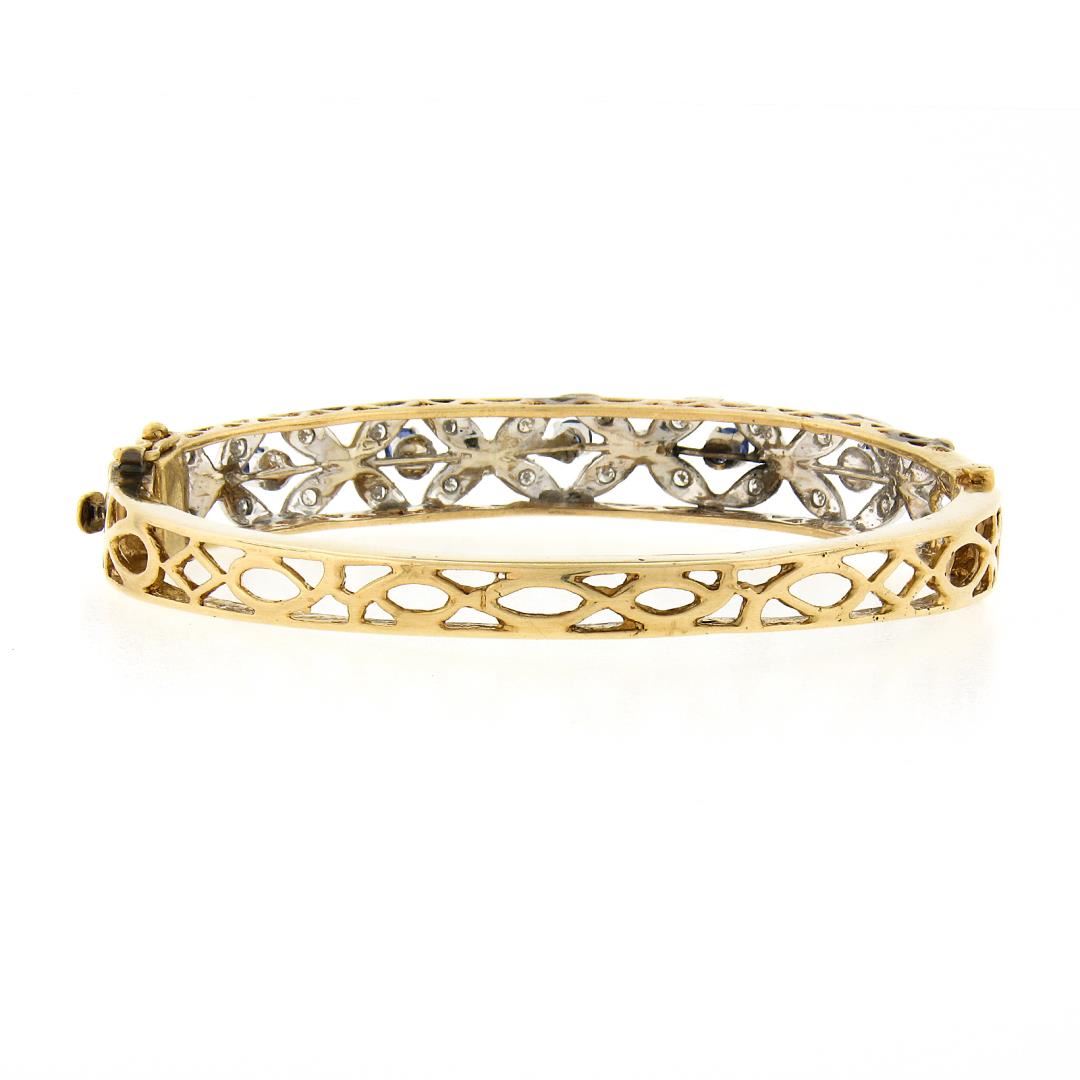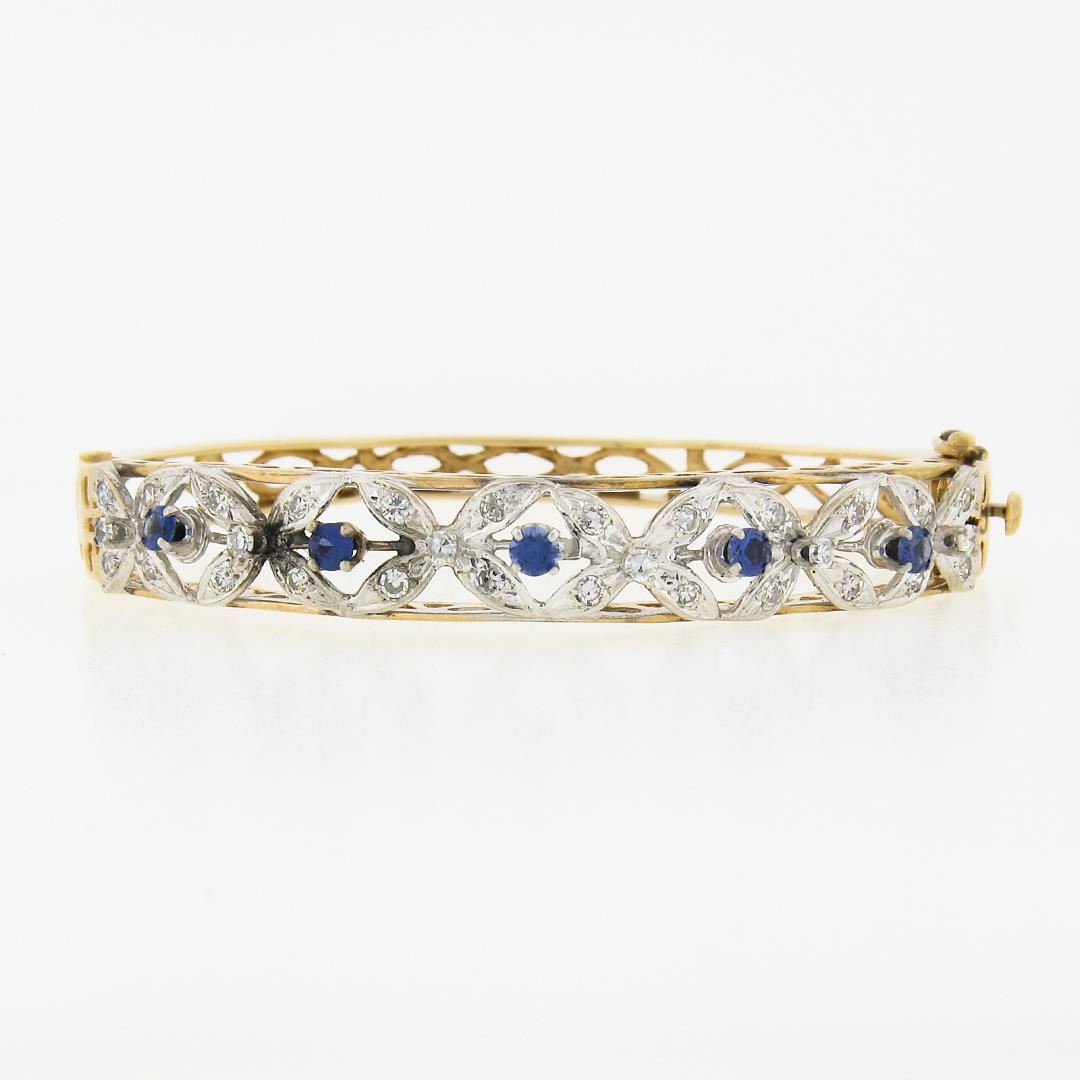 A vintage solid 14k two tone gold hinged bangle bracelet, with 5 round brilliant cut natrual sapphires (0.75ctw), and 30 old single cut natural diamonds (G/H - VS2/SI1 Clarity ; 0.75ctw). It weighs a total of 20.49 grams, measures 9.40mm wide, and measures 6.25 inches in length.