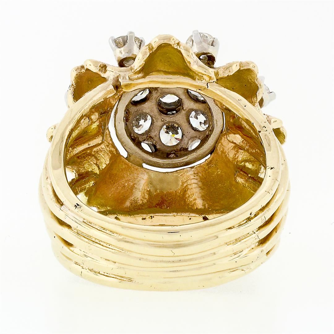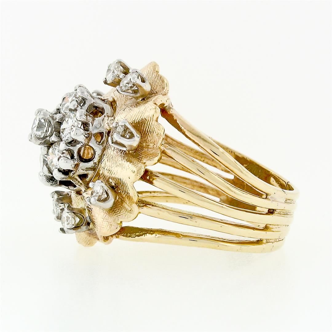 A vintage solid 14k two tone gold cluster flower ring , with 15 round brilliant cut natural diamonds (F/G - VS1-SI1; 1.67 ctw). The ring is size 6.5, weighs a total of 10.80 grams, and measures 20.9mm wide.