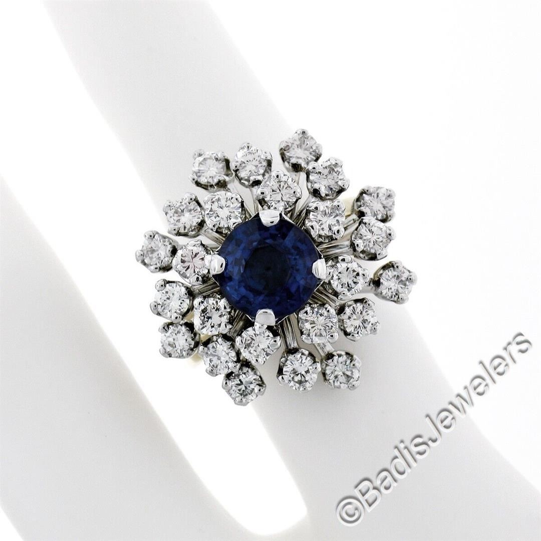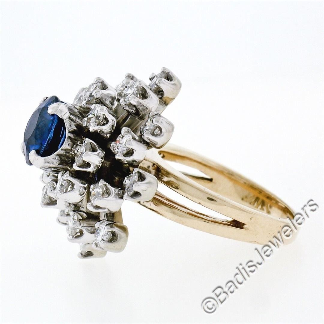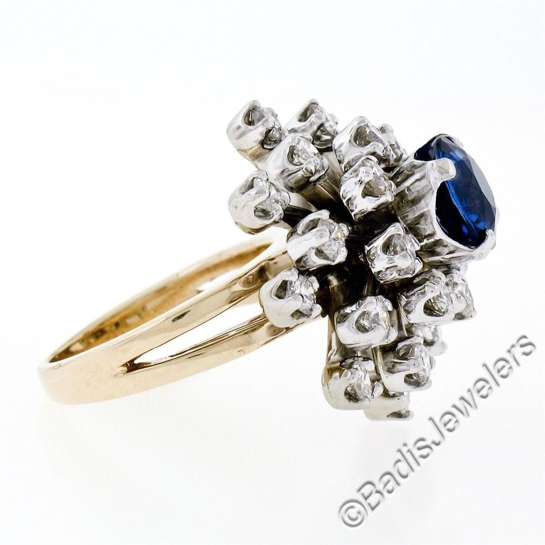 A vintage solid yellow and white gold snowflake ring, featuring 1 round brilliant cut natural sapphire (1.82ct), surrounded with a halo of 24 round brilliant cut natural diamonds (F/G - VVS2/VS1; 1.44ctw). The ring is size 4.0, weighs a total of 10.52 grams, and measures 20.90mm wide.