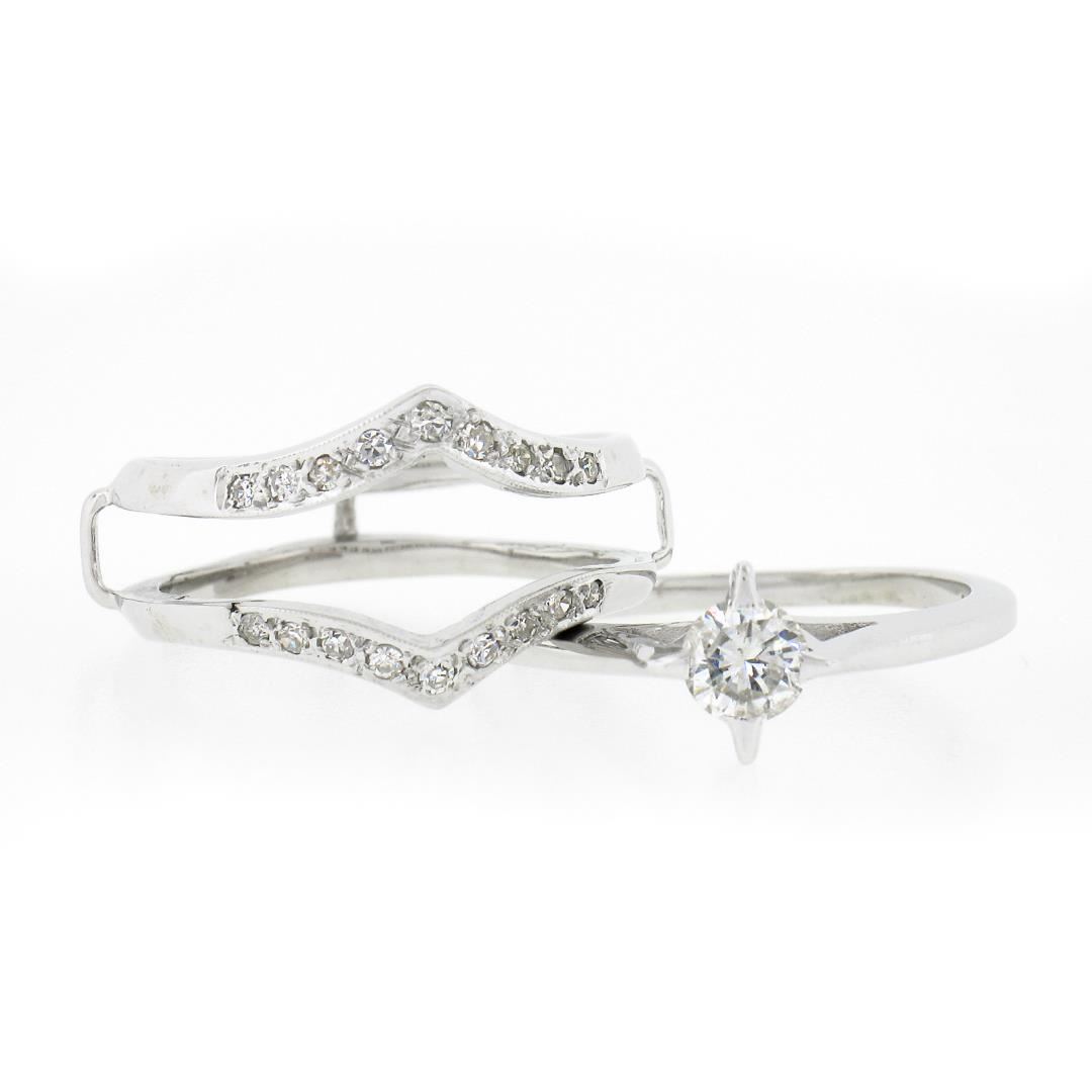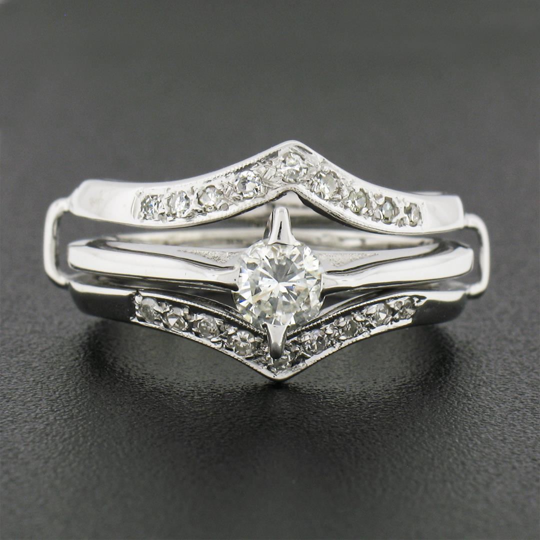 A vintage solid 14k white gold engagement & wedding ring set, with 1 old transitional cut natural diamond (G - I1 ; 4.77mm / 0.44ct ), and 18 single cut natural diamonds (G/H - I1/I2 ; 0.18ctw). The ring is size 8.0, weighs a total of 7.55 grams, and measures 12.40mm wide.