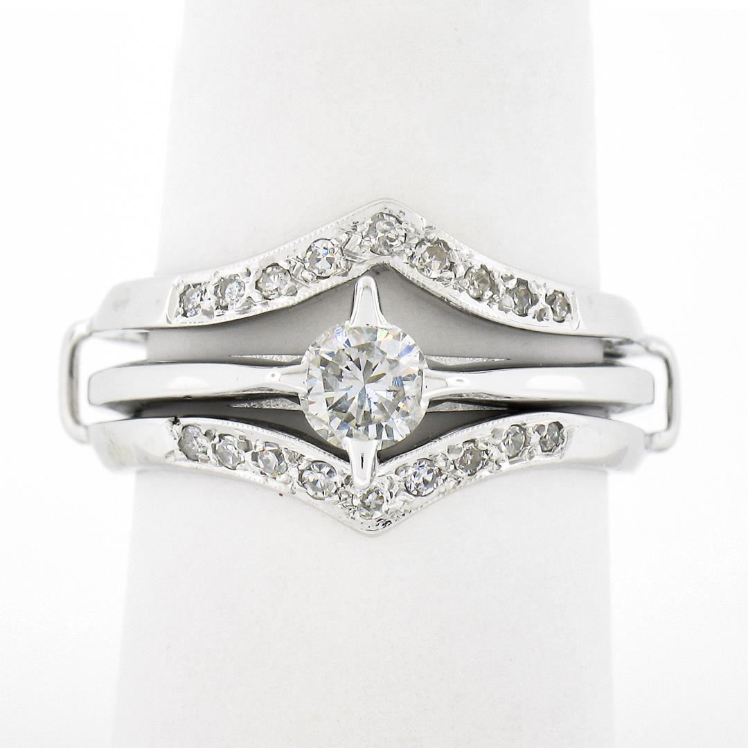A vintage solid 14k white gold engagement & wedding ring set, with 1 old transitional cut natural diamond (G - I1 ; 4.77mm / 0.44ct ), and 18 single cut natural diamonds (G/H - I1/I2 ; 0.18ctw). The ring is size 8.0, weighs a total of 7.55 grams, and measures 12.40mm wide.