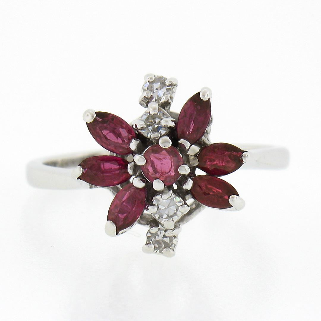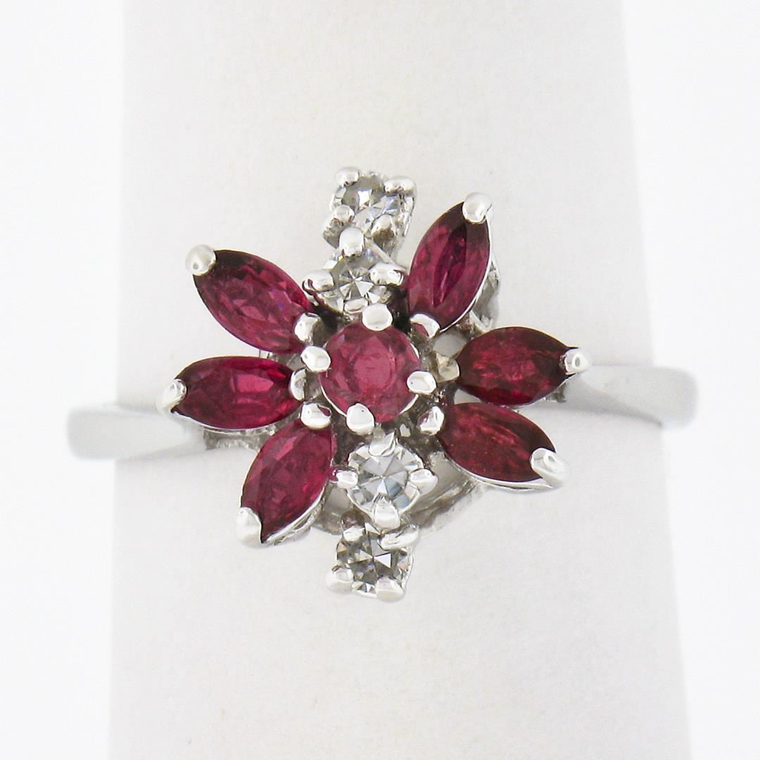 A vintage solid 14k white gold spray ring, with 6 marqiuse cut & 1 round cut natural rubies ( 0.70ctw ), and 4 old single cut natural diamonds (H - VS2 ; 0.10ctw). The ring is size 5.5, weighs a total of 2.56 grams, and measures 12.2mm wide.