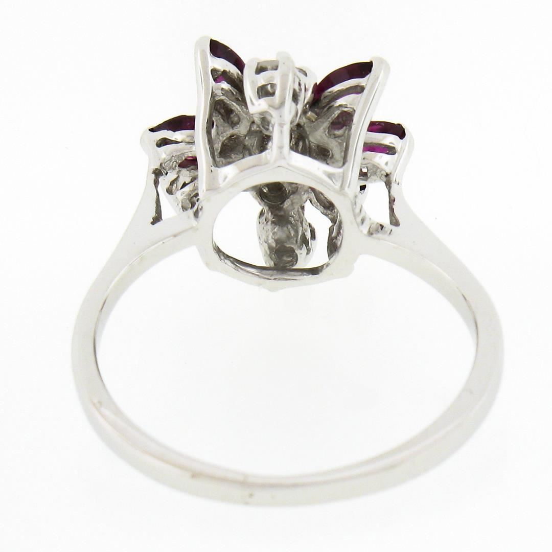 A vintage solid 14k white gold spray ring, with 6 marqiuse cut & 1 round cut natural rubies ( 0.70ctw ), and 4 old single cut natural diamonds (H - VS2 ; 0.10ctw). The ring is size 5.5, weighs a total of 2.56 grams, and measures 12.2mm wide.