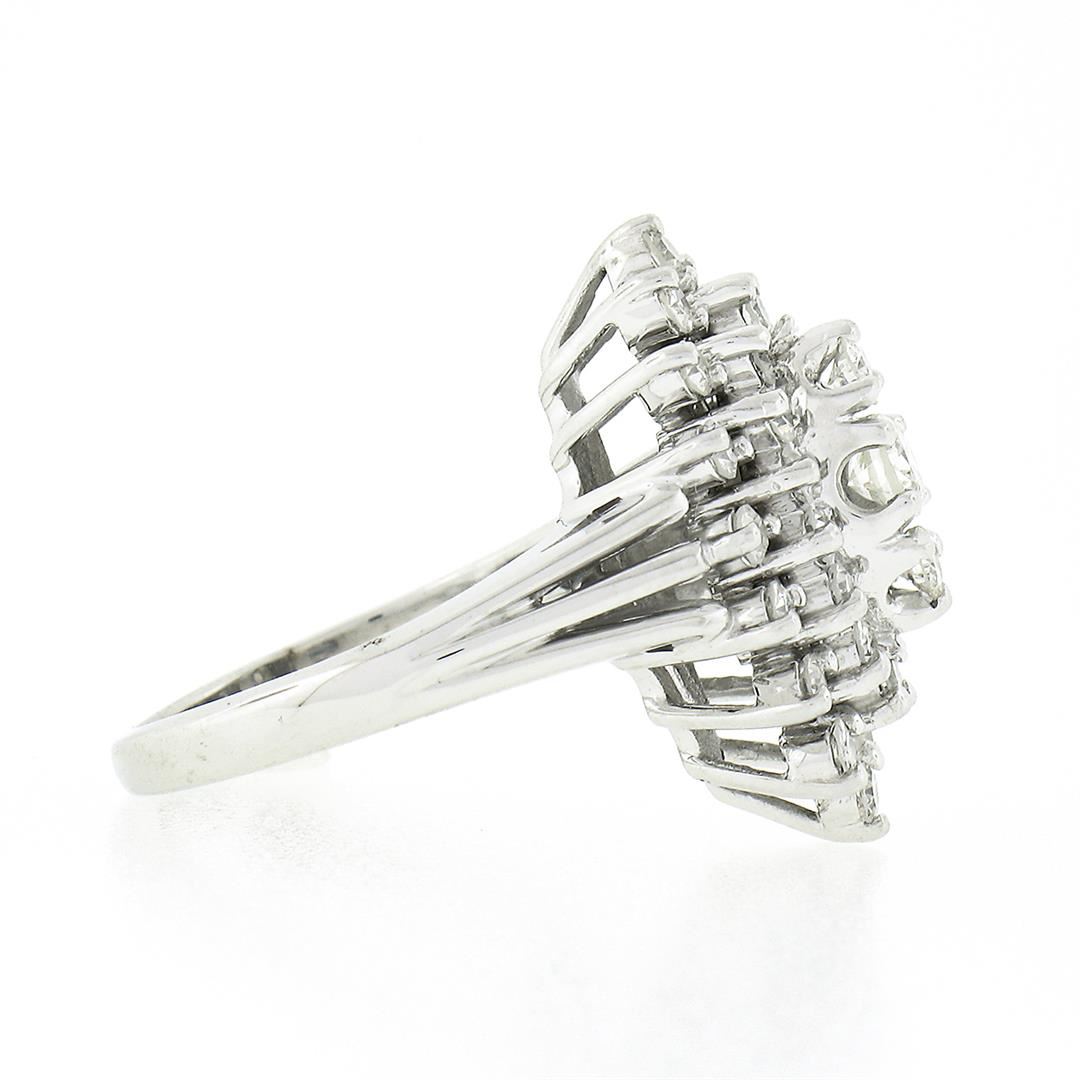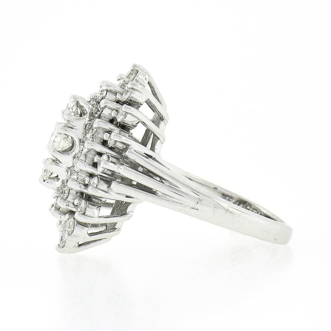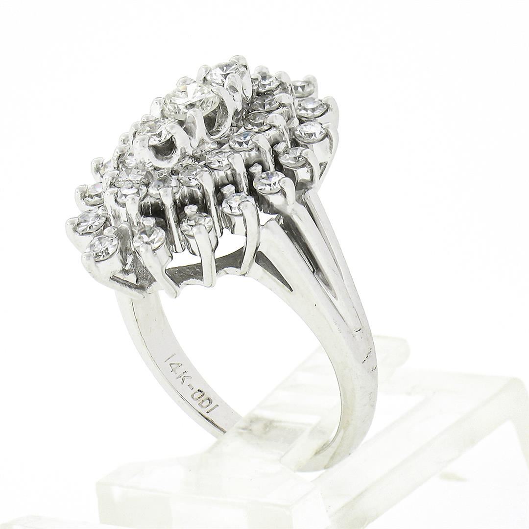 A solid 14k white gold navette tiered ring, with 3 old transitional cut natural diamonds (G/I - VS2/SI1 ; 0.23ctw), and 30 old single cut natural diamonds (G/I - VS2-SI2; 0.80ctw). The ring is size 4.5, weighs a total of 6.48 grams, and measures 20mm wide