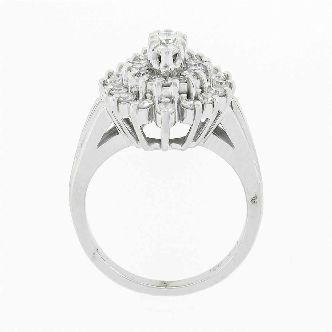 A solid 14k white gold navette tiered ring, with 3 old transitional cut natural diamonds (G/I - VS2/SI1 ; 0.23ctw), and 30 old single cut natural diamonds (G/I - VS2-SI2; 0.80ctw). The ring is size 4.5, weighs a total of 6.48 grams, and measures 20mm wide