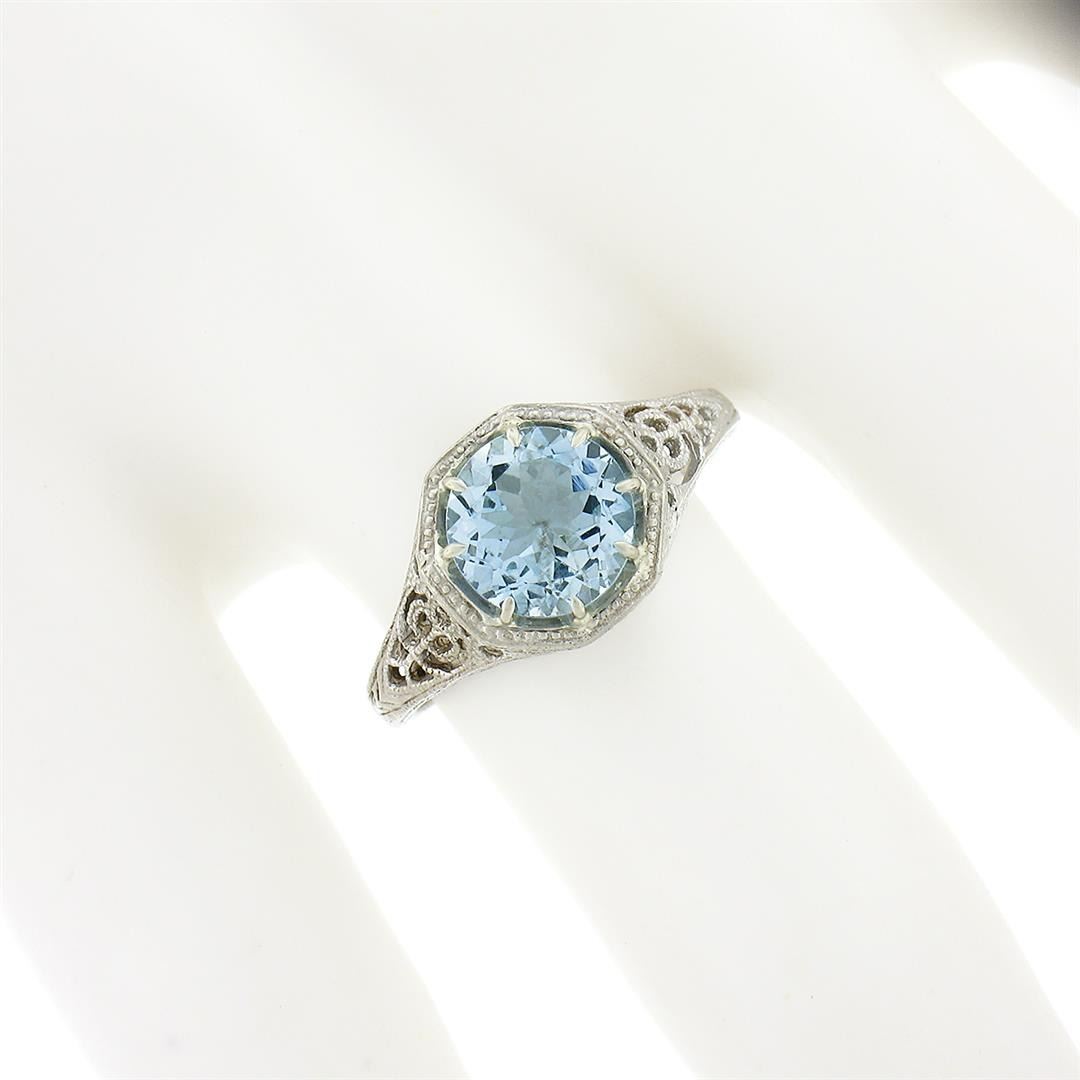 A vintage solid 14k white gold solitaire ring, with 1 round cut natural aquamarine (1.32ct). The ring is size 6.0, weighs a total of 2.23 grams, and measures 9.55mm wide.