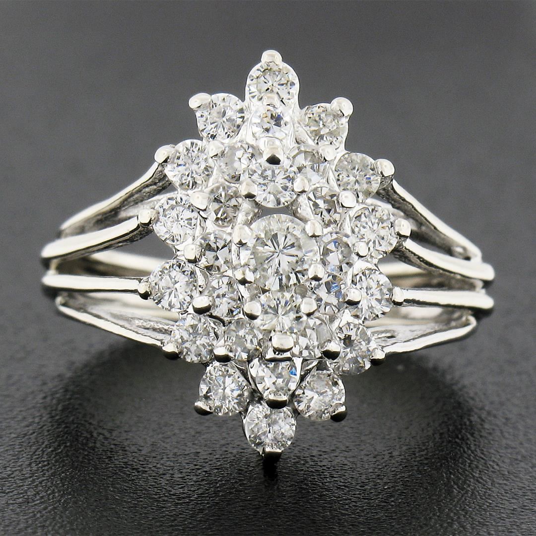 A vintage solid 14k white gold ring, with 29 single & round brilliant cut natural diamonds (F/G - SI1/SI2 ; 1.35ct). The ring is size 6.5, weighs a total of 4.42 grams, and measures 17.60mm wide.