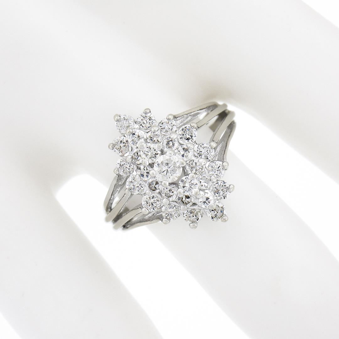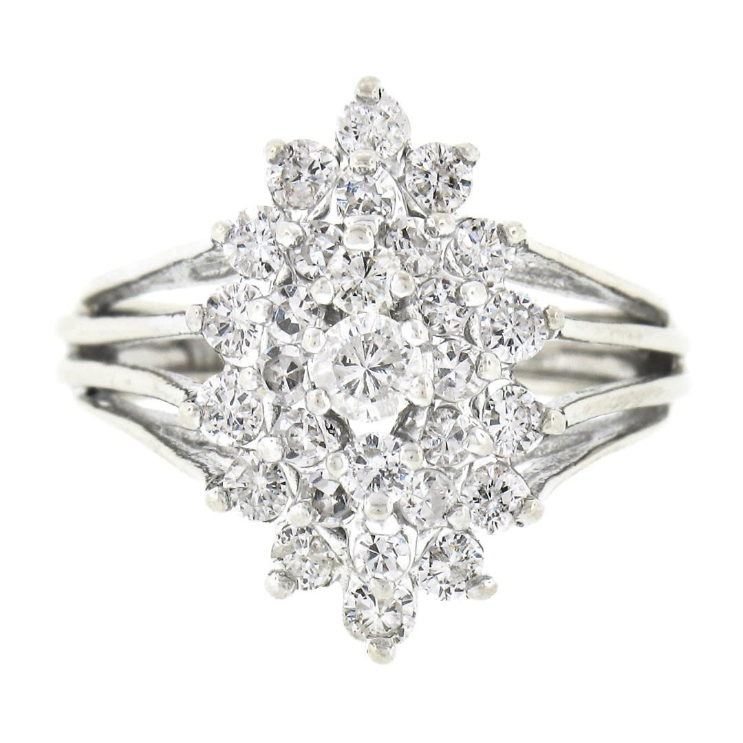 A vintage solid 14k white gold ring, with 29 single & round brilliant cut natural diamonds (F/G - SI1/SI2 ; 1.35ct). The ring is size 6.5, weighs a total of 4.42 grams, and measures 17.60mm wide.