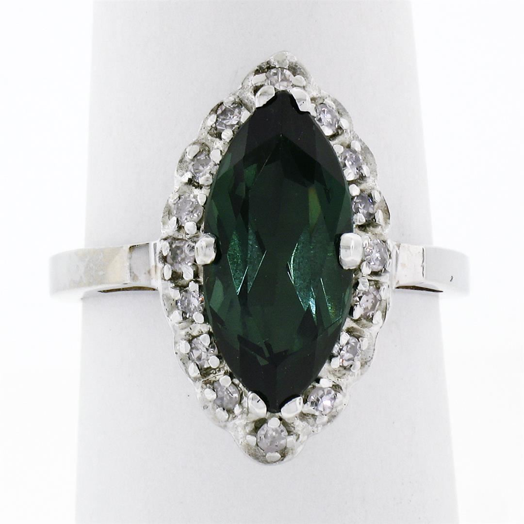 A vintage solid 14k white gold solitaire ring, with1 marquise cut natural tourmaline (15.2x7.4mm- 2.50ct ), surrounded with a halo of 16 old single cut natural diamonds (G/H- VS2/SI1; 0.22ctw). The ring is size 7.5, weighs a total of 4.91 grams, and measures 19.70mm wide.