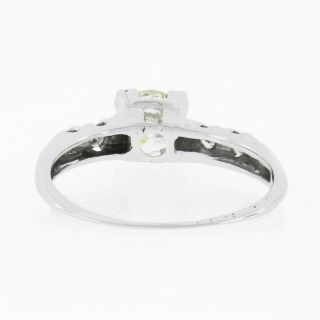 A vintage solid 14k white gold engagement ring, with 1 old transitional cut natural diamond (H - VS2 ; 0.65ct ), accented with 4 old single cut natural diamonds (G/H - VS1/VS2 ; 0.08ctw). The ring is size 5.5, weighs a total of 1.61 grams, and measures 5.6mm wide.