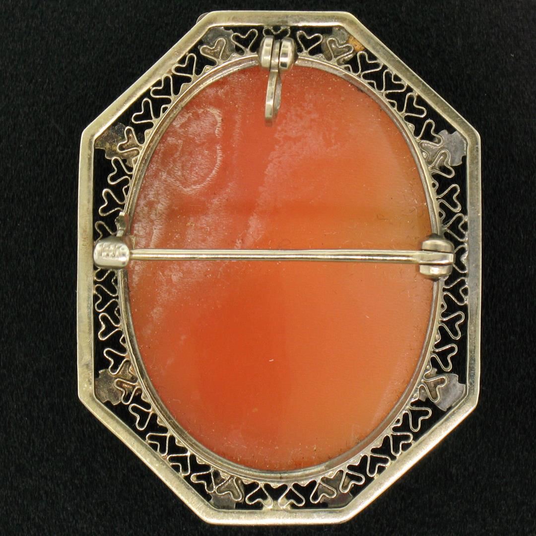 A vintage brooch featuring a genuine carved shell cameo (28.31x22.50mm) bezel set in a solid 14k white gold frame. Measures 35.80x28.05mm and weighs a total of 6.65 grams.