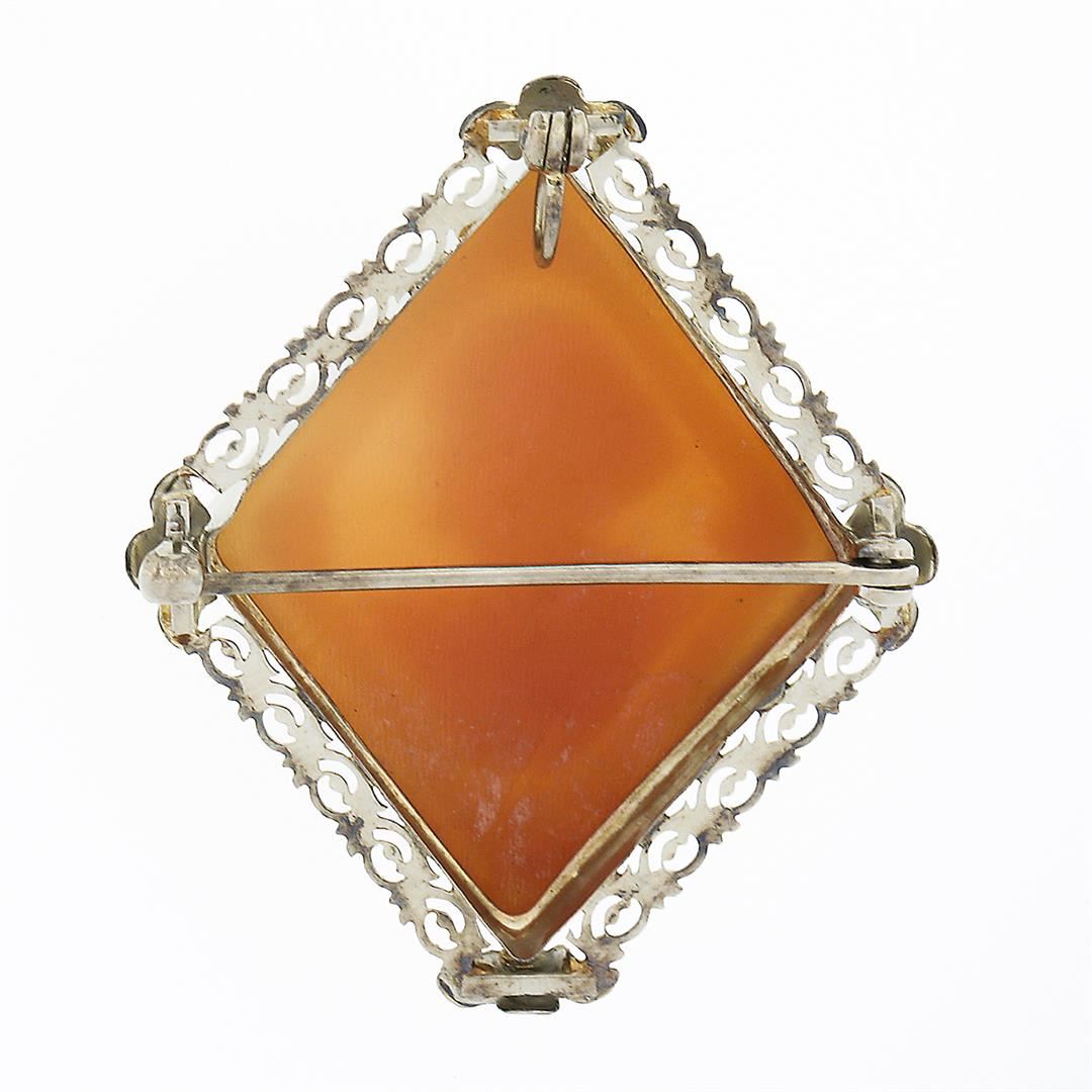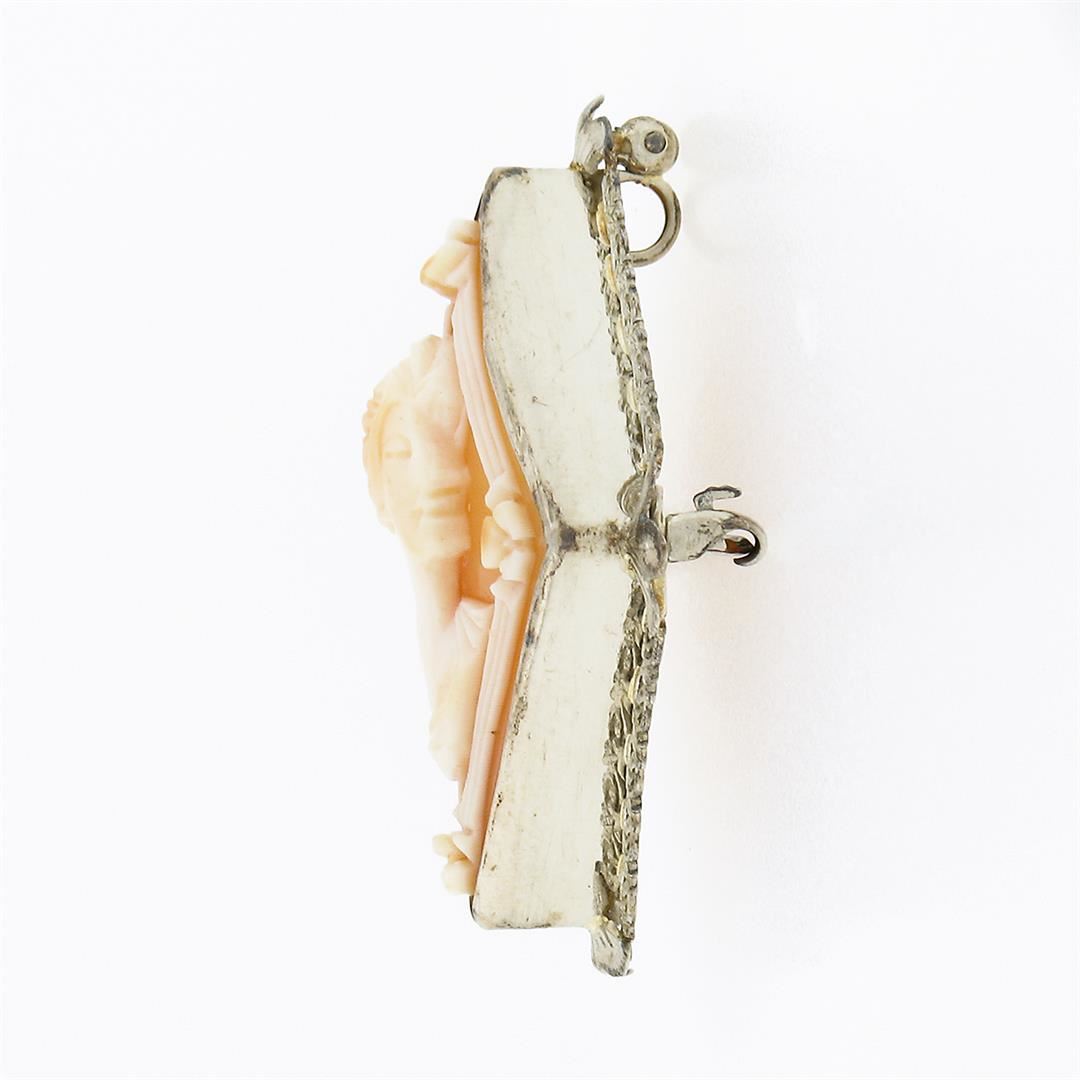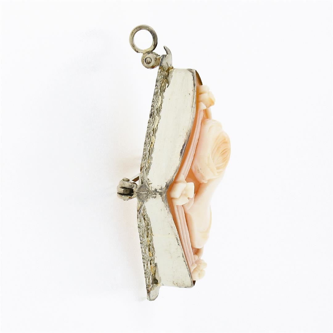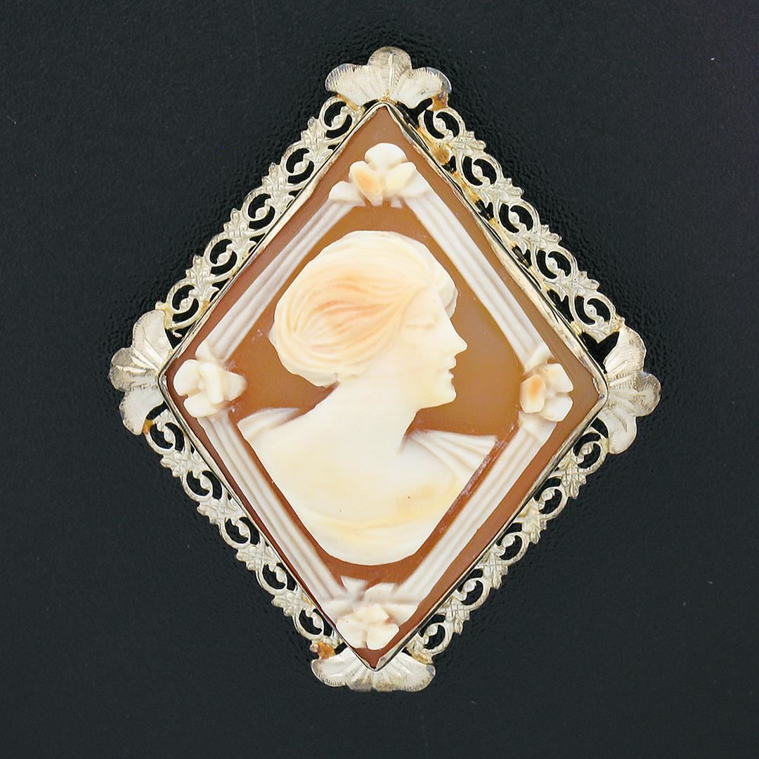 A vintage solid 14k white gold brooch pendant, with 1 oval carved shell cameo (33.20x26.0mm). Measures 42.0x33.10mm and weighs a total of 6.41 grams.