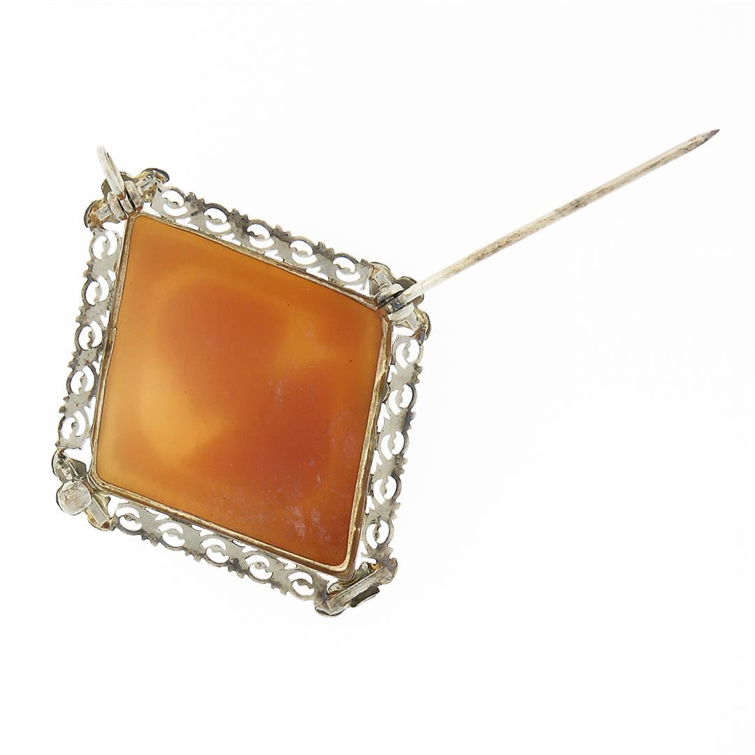 A vintage solid 14k white gold brooch pendant, with 1 oval carved shell cameo (33.20x26.0mm). Measures 42.0x33.10mm and weighs a total of 6.41 grams.