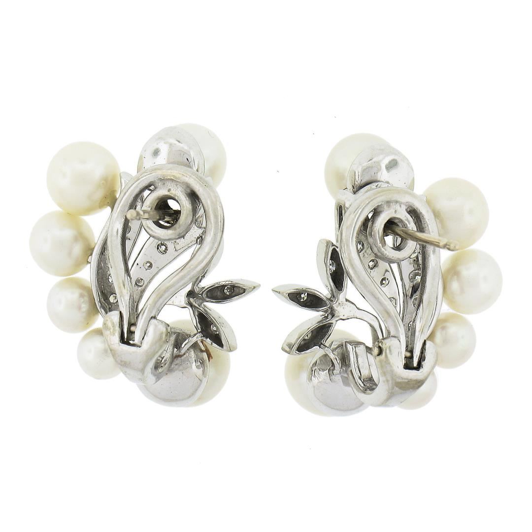 A vintage solid 14k white gold flower earrings, with 12 round shape cultured pearls (7.4mm to 4.6mm each), and 28 old single cut natural diamonds (G/H - VS2/SI1 ; 0.25ctw). The earrings measure approximately 24.50x20.50mm and weigh a total of 11.49 grams.