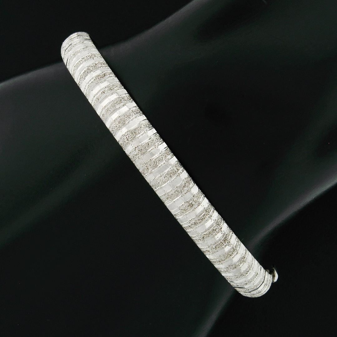 A vintage solid 14k white gold textured hinged open bangle bracelet. It weighs a total of 9.41 grams, measures 63.4mm wide, and measures 6.5 inches in length.