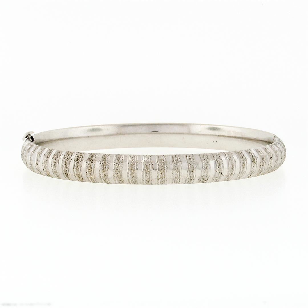A vintage solid 14k white gold textured hinged open bangle bracelet. It weighs a total of 9.41 grams, measures 63.4mm wide, and measures 6.5 inches in length.