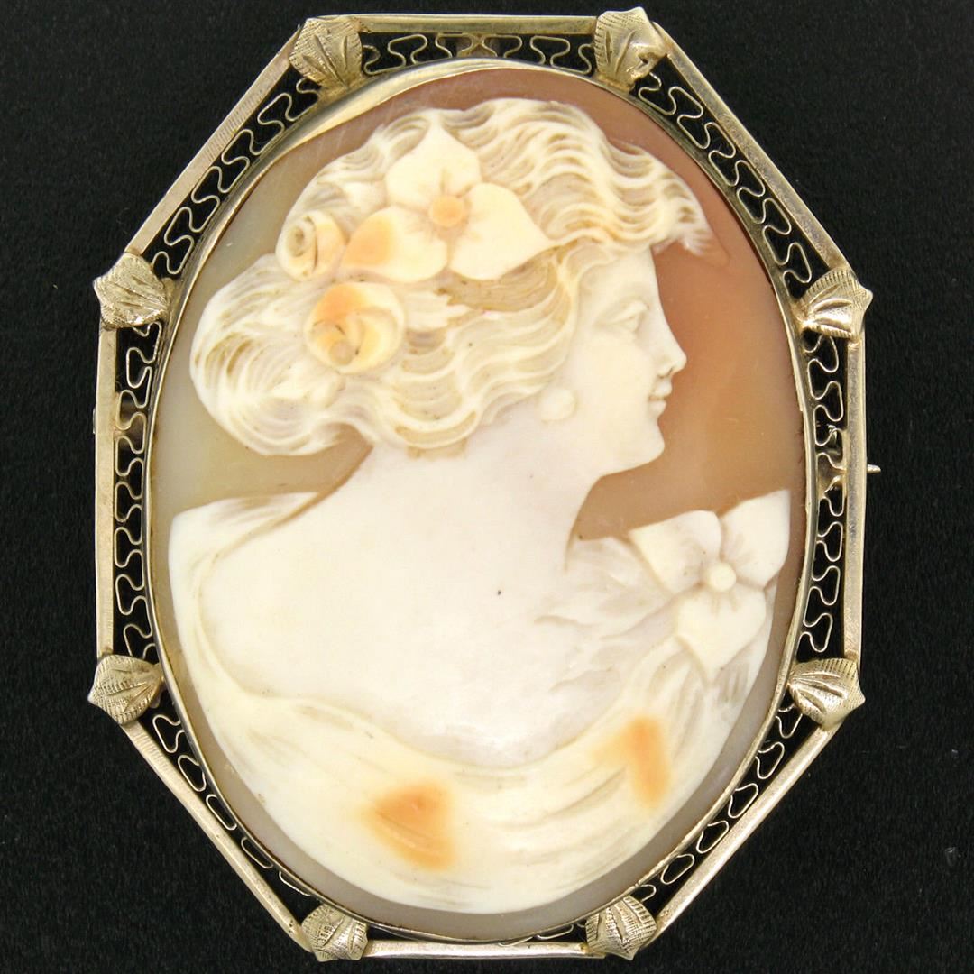 Vintage 14K White Gold Large Oval Octagon Open Detailed Cameo Pin Brooch Pendant