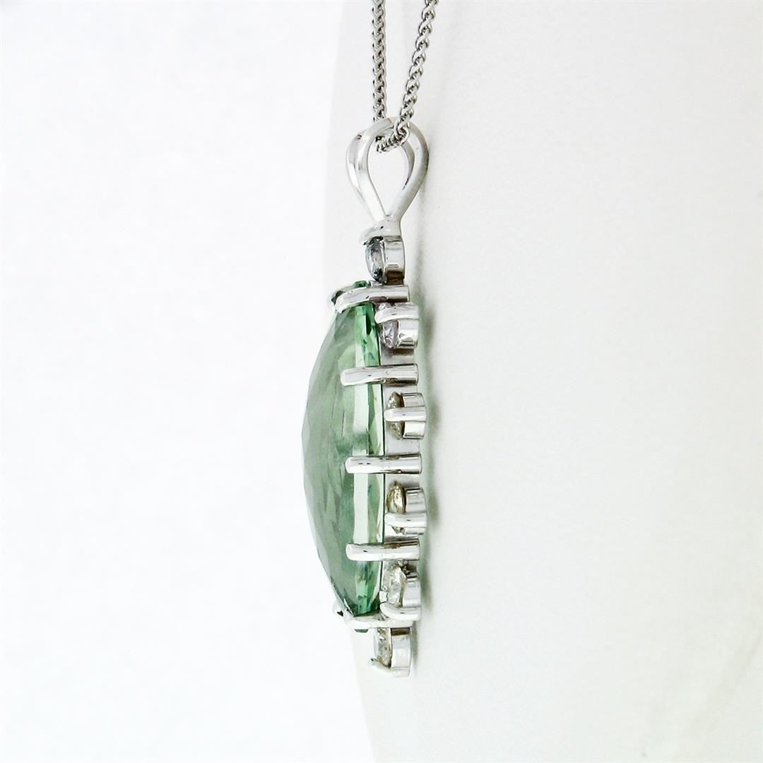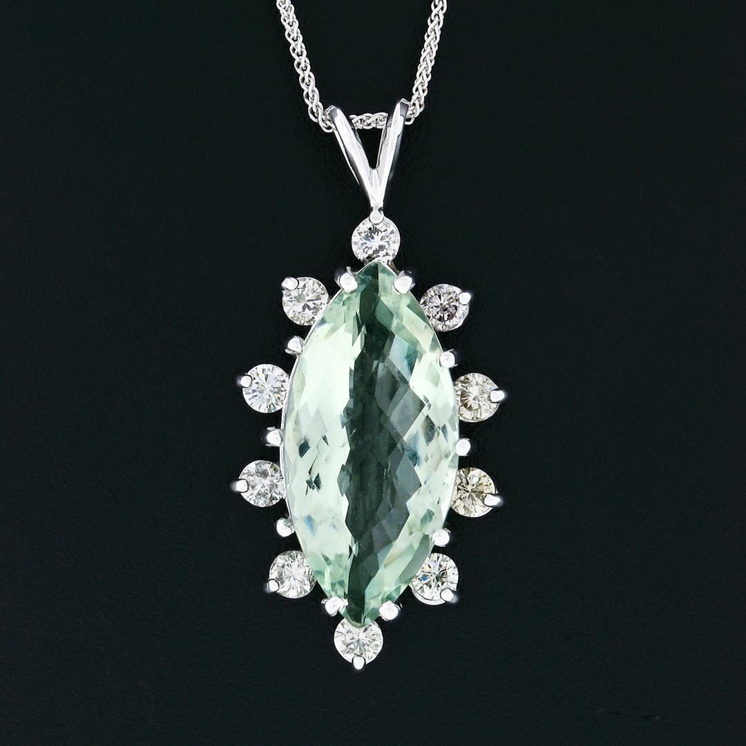 A vintage solid 14k white gold pendant necklace, with 1 marquise cut natural sea green amethys (23.50x11.0mm), and a halo of round brilliant and old transitional cut natural diamonds (G/H - VS2 -SI2 ; 1.15ctw). The pendant weighs a total of 7.38 grams, measures 37.35x18mm including the bail, with 18 inch wheat link chain.