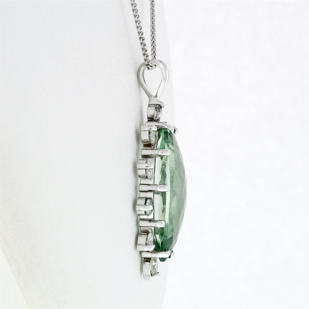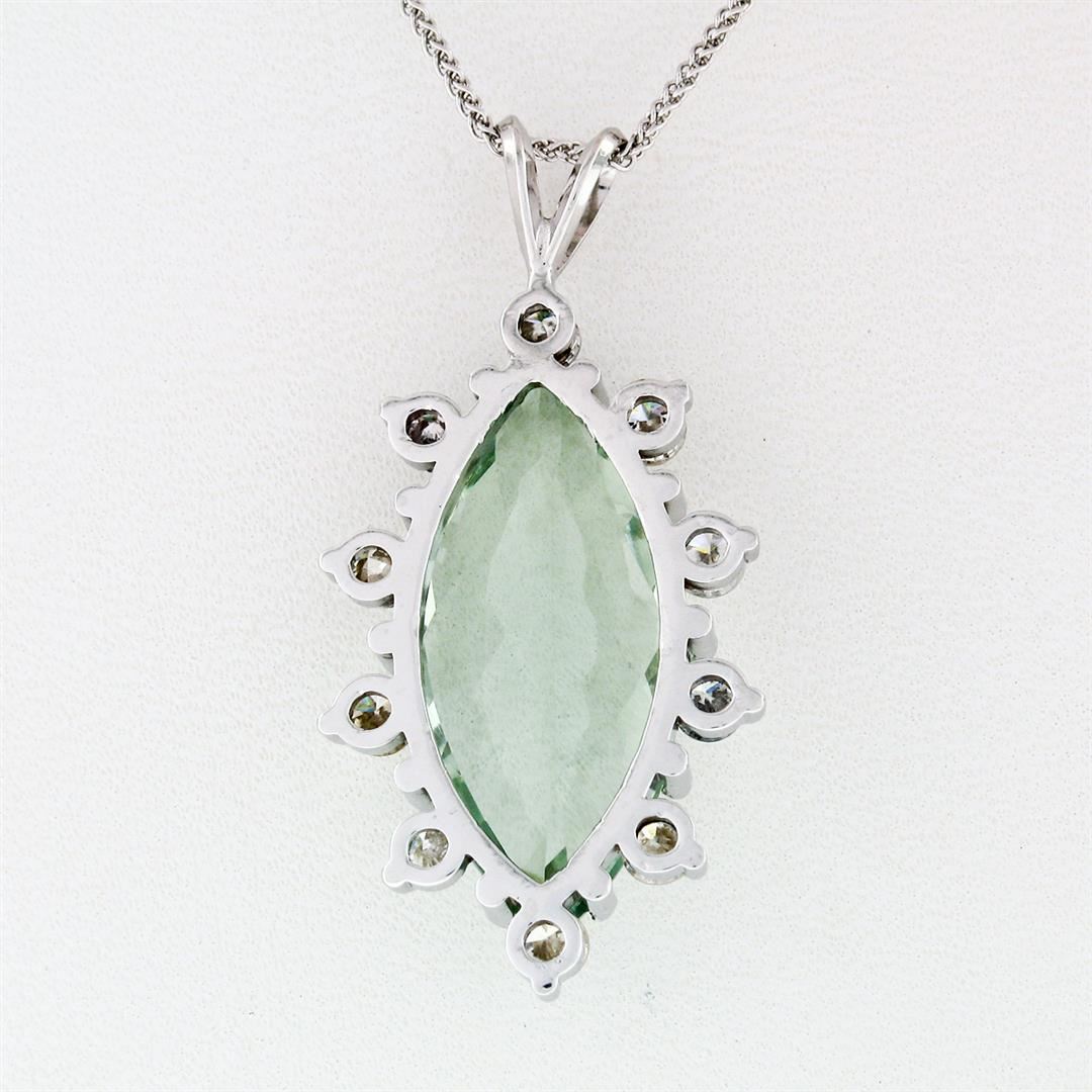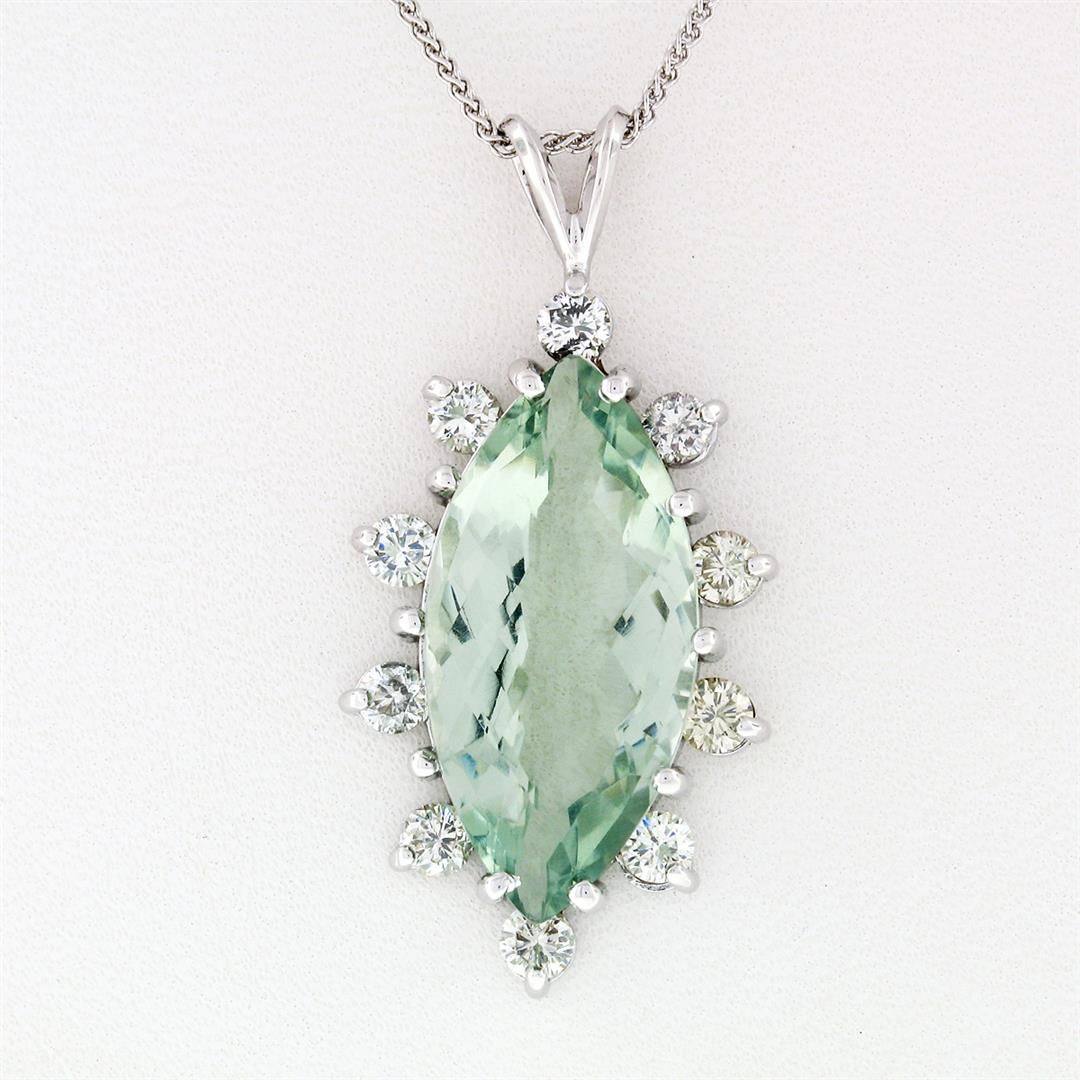 A vintage solid 14k white gold pendant necklace, with 1 marquise cut natural sea green amethys (23.50x11.0mm), and a halo of round brilliant and old transitional cut natural diamonds (G/H - VS2 -SI2 ; 1.15ctw). The pendant weighs a total of 7.38 grams, measures 37.35x18mm including the bail, with 18 inch wheat link chain.