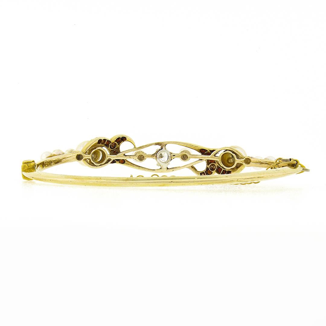 A solid 14k yellow gold hinged bangle bracelet, with 1 old transitional cut natural diamond (G - SI2 ; 0.22ctw), 20 round cut natural garnets (0.30ctw), and 10 round shape cultured pearls (6.4 to 3.5mm each). It weighs a total of 12.26 grams, measures 8.6
