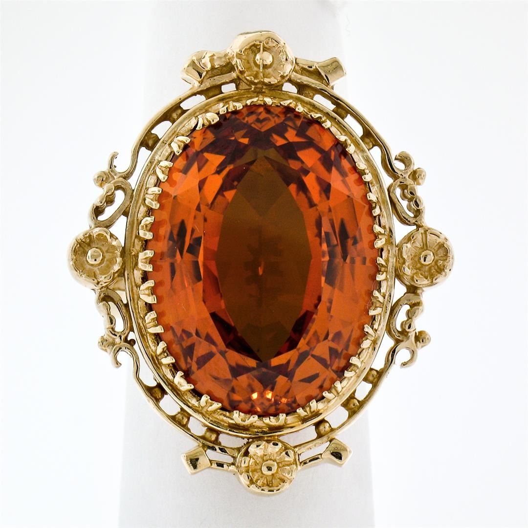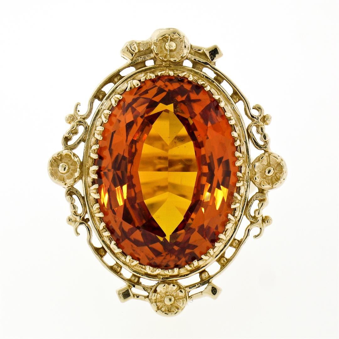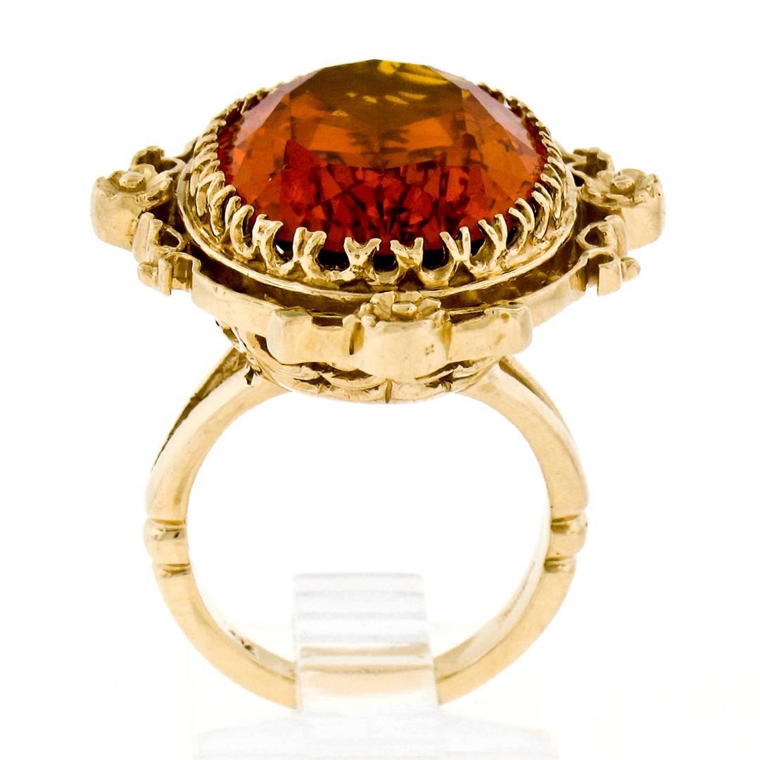 A vintage solid 14k yellow gold ring, featuring 1 oval cut natural citrine (21.0x15.4x6.89mm - 12.00ct). The ring is size 5.5, weighs a total of 14.82 grams, and measures 25.35mm wide.