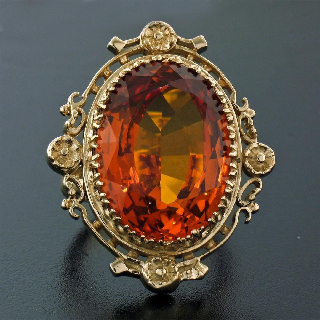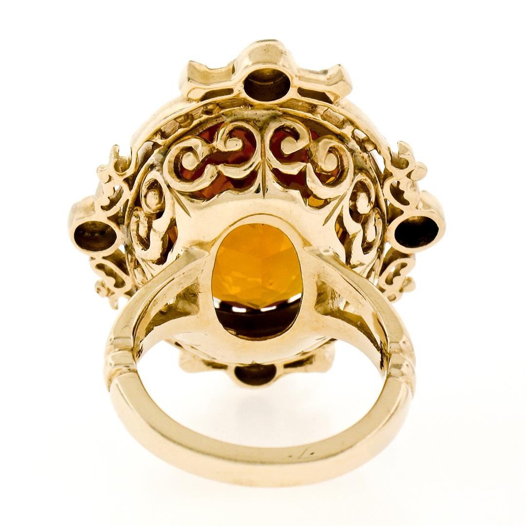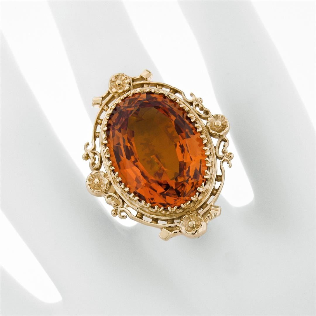 A vintage solid 14k yellow gold ring, featuring 1 oval cut natural citrine (21.0x15.4x6.89mm - 12.00ct). The ring is size 5.5, weighs a total of 14.82 grams, and measures 25.35mm wide.