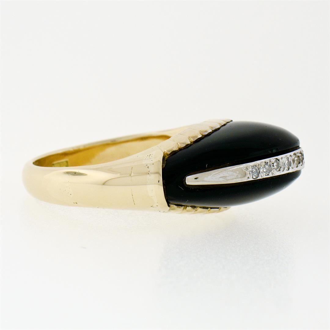 A vinatge solid 14k yellow gold ring, with 1 domed custom cut natural black onyx, and 11 old single cut natural diamonds (H/I - VS2 ; 0.13ctw). The ring is size 6.5, weighs a total of 6.42 grams, and measures 9.0mm wide.