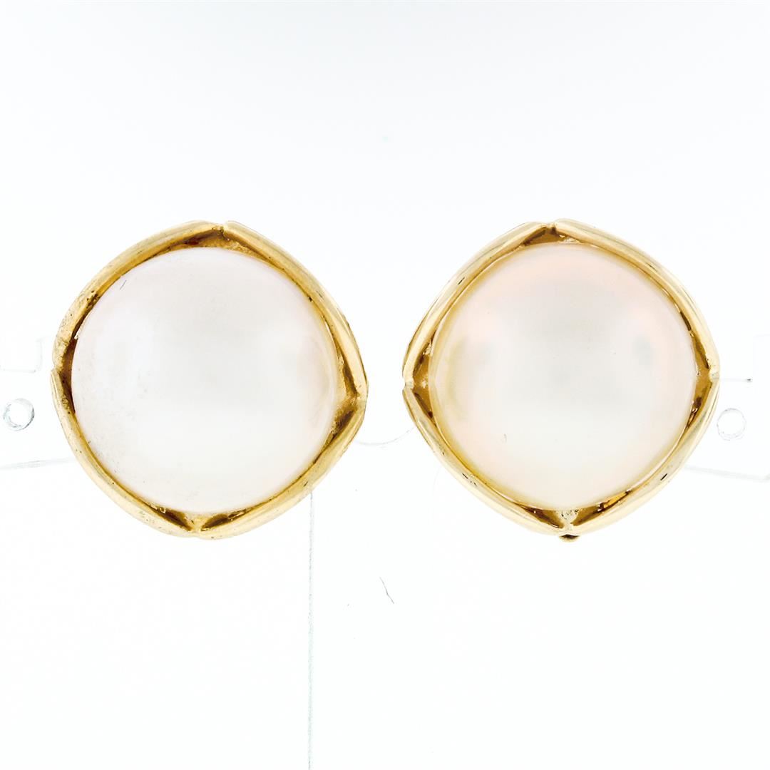 A vintage solid 14k yellow gold button earrings, with 2 round shape geuine cultured mabe pearls (16.50mm). The earrings measure approximately 19.70mm in diameter and weigh a total of 10.0 grams.