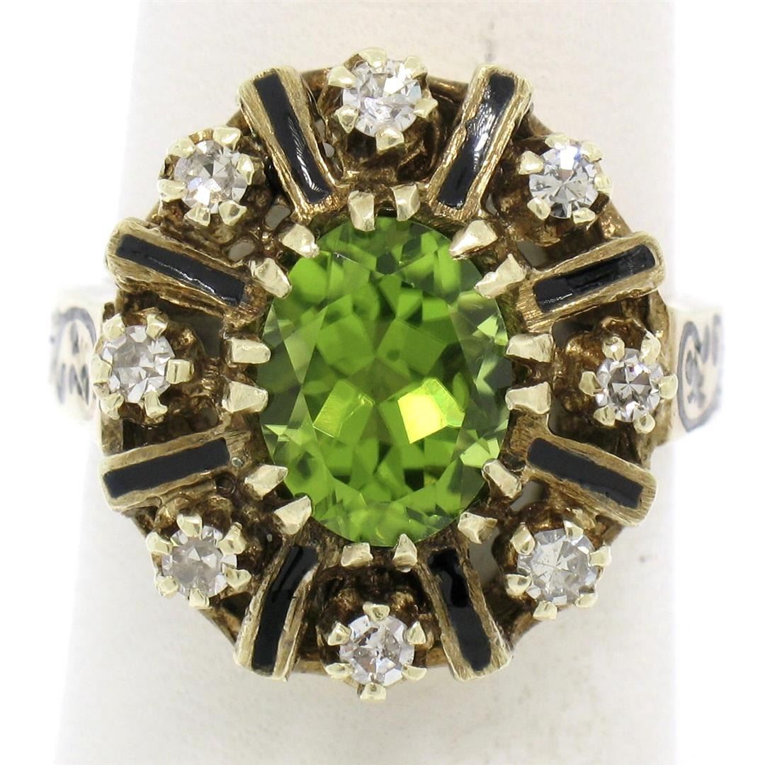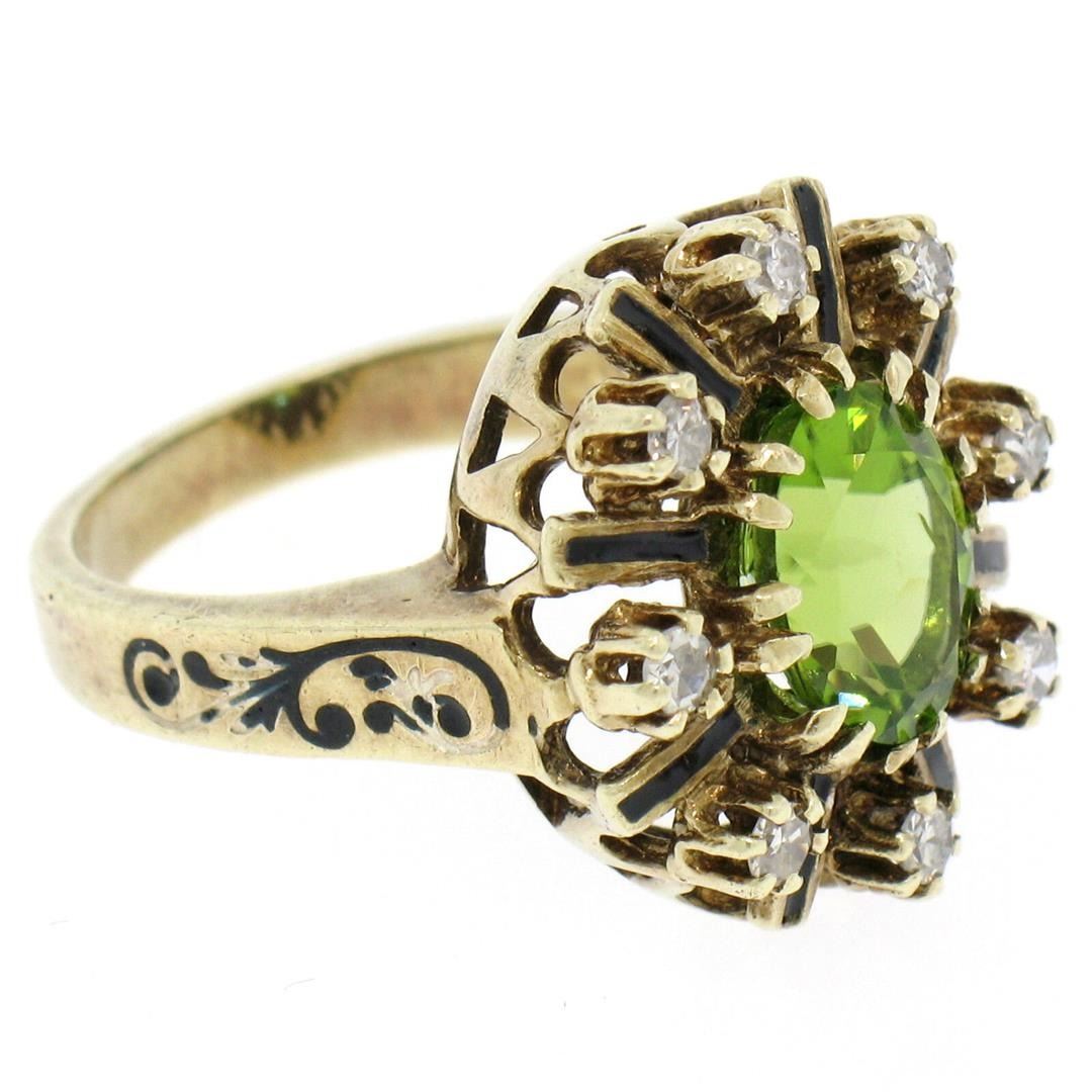 Vintage 14K Yellow Gold 2.43ctw Oval Peridot Diamond & Black Enamel Halo Ring. Please see photos and description for all available information. a vintage solid 14k yellow gold cocktail ring, with 1 oval cut natural peridot (2.08ct ), surrounded with a hal