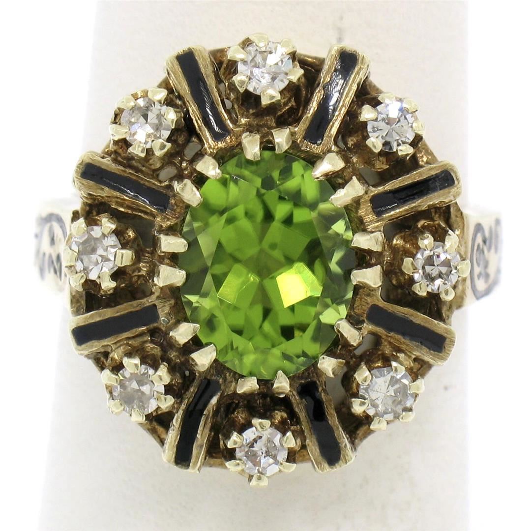 Vintage 14K Yellow Gold 2.43ctw Oval Peridot Diamond & Black Enamel Halo Ring. Please see photos and description for all available information. a vintage solid 14k yellow gold cocktail ring, with 1 oval cut natural peridot (2.08ct ), surrounded with a halo of black enamel work and 8 round single cut nautral diamonds (F/G- VS1/VS2 ; 0.35ctw). The ring is size 6.0, weighs a total of 7.39 grams, and measures 17.73mm wide.