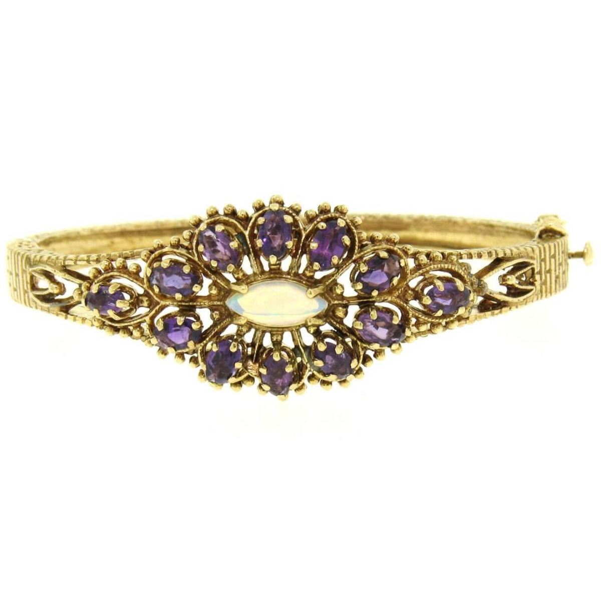 One Vintage 14K Yellow Gold 3.75ct Amethyst & Opal Filigree Textured Bangle Bracelet. Item Details: Material: 14K Solid Yellow Gold, Weight: 18.8 Grams, Stone(s): (12) Natural Genuine Amethyst - Oval Cut - Prong Set - Royal Purple Color - 3.00 ctw (approx.), (1) Natural Genuine Opal - Marquise Cabochon Cut - Prong Set - White Base Color w/ Beautiful Green and Blue Play - 0.75ctw (approx), Total Carat Weight: 3.75ctw (approx.), Clasp: Box type clasp w/ safety latch, Size: Fits up to 6.5 inch wrist, Width: 20.4mm Height: 8.45mm rise off the wrist Condition: Vintage piece. Excellent condition w/ amazing patina!