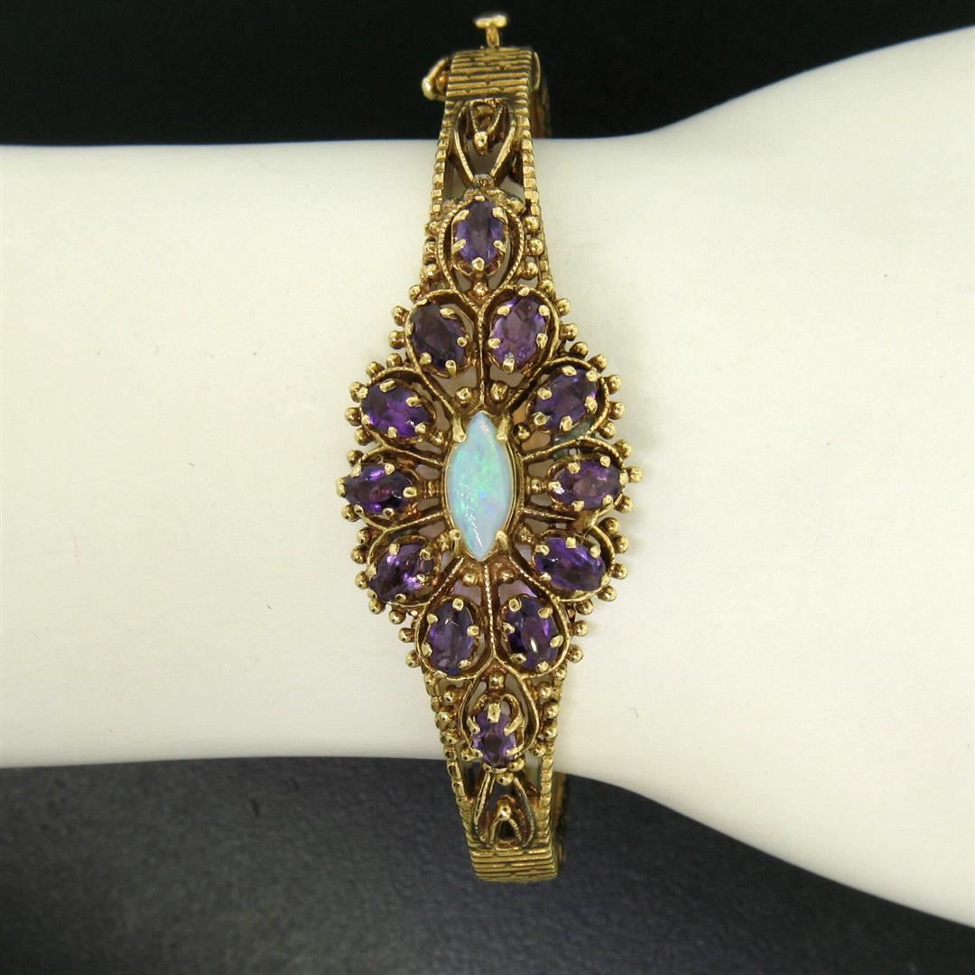 A vintage solid 14k yellow gold bangle bracelet, featuring 1 marquise cabochon cut natural opal (0.75ctw), with a halo of 12 oval cut natural amethyst (3.00ctw ). It weighs a total of 18.8 grams, measures 20.4mm wide, and measures 6.5 inches in length.