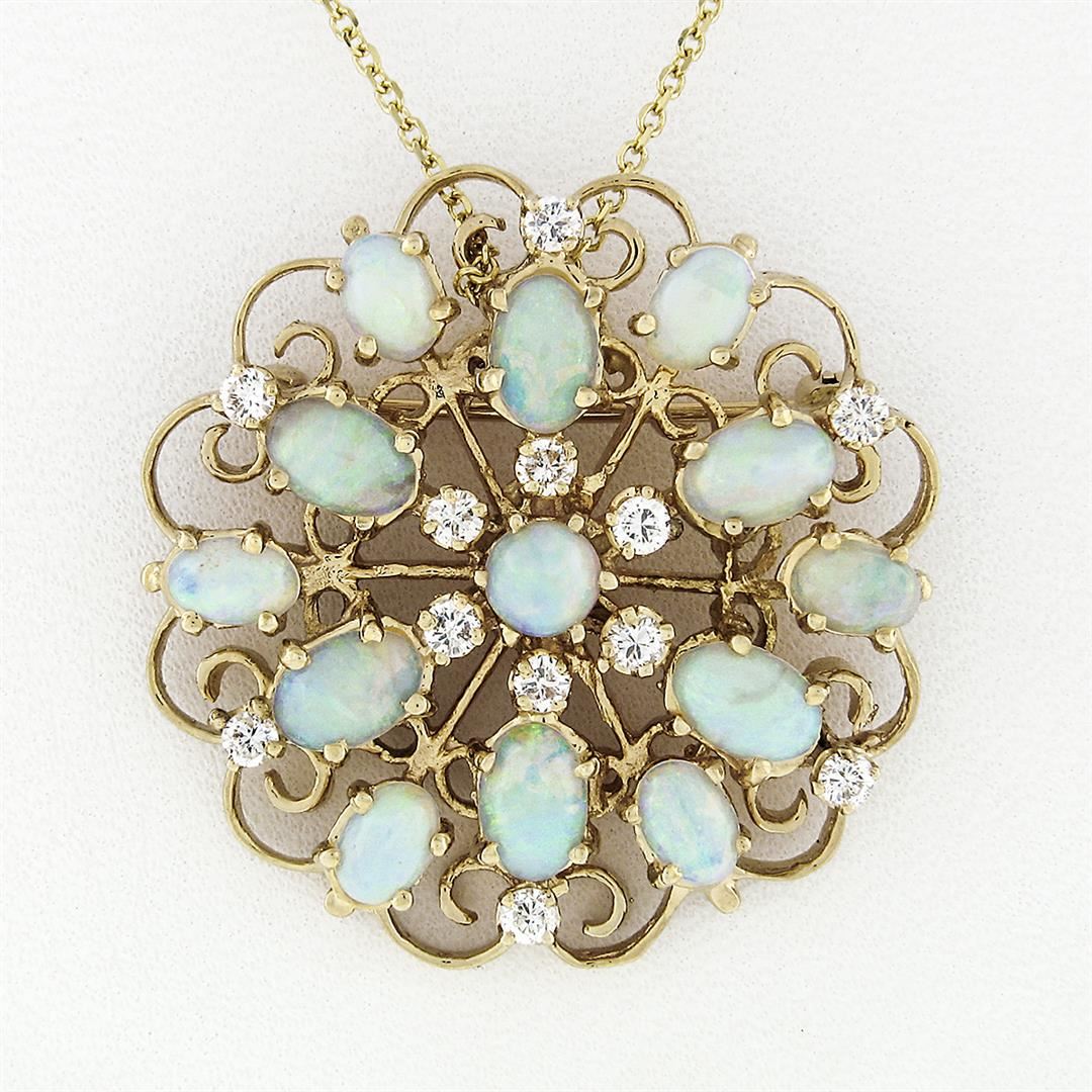 a vintage solid 14k yellow gold brooch pendant necklace. with 13 round & oval cabochon cut natural opals (6x4mm (6 Opals) - 5x3.5mm (6 Opals) - 4.3mm (1 Round Opal)), & 12 round brilliant cut natural diamonds (G/H- VS2/SI1; 0.42ctw). 18 inch cable link chain, 11.51 grams total weight, pendant measures 30.25mm in diameter.