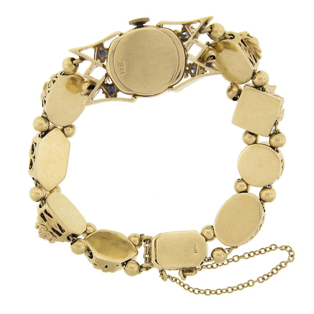 A vintage solid 14k yellow gold hidden watch bracelet, featuring Numerous Natural Genuine Stones Including Citrine, Coral, Garnet, Amethyst, Mother of Pearl, Sapphire, Ruby, Emerald, Turquoise & Cultured Pearls. It weighs a total of 40.6 grams, measures 16.3mm wide, and measures 6.25 inches in length.