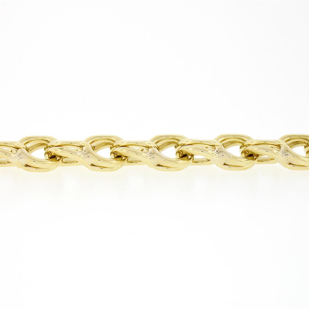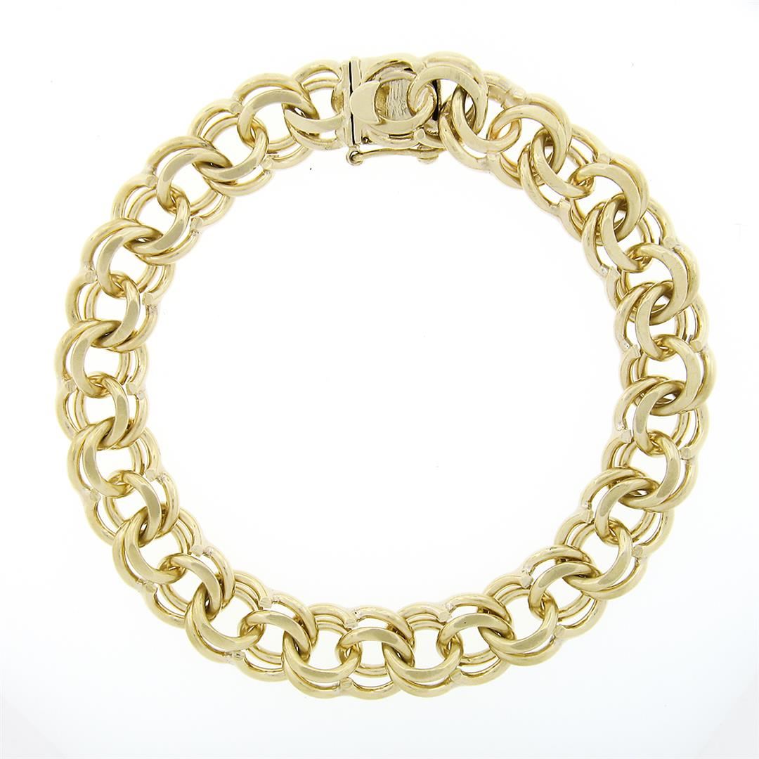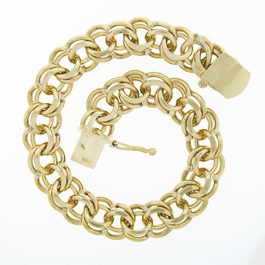 A vintage solid 14k yellow gold double loop open ring link bracelet. It weighs a total of 23.37 grams, measures 9.2mm wide, and measures 6 inches in length.