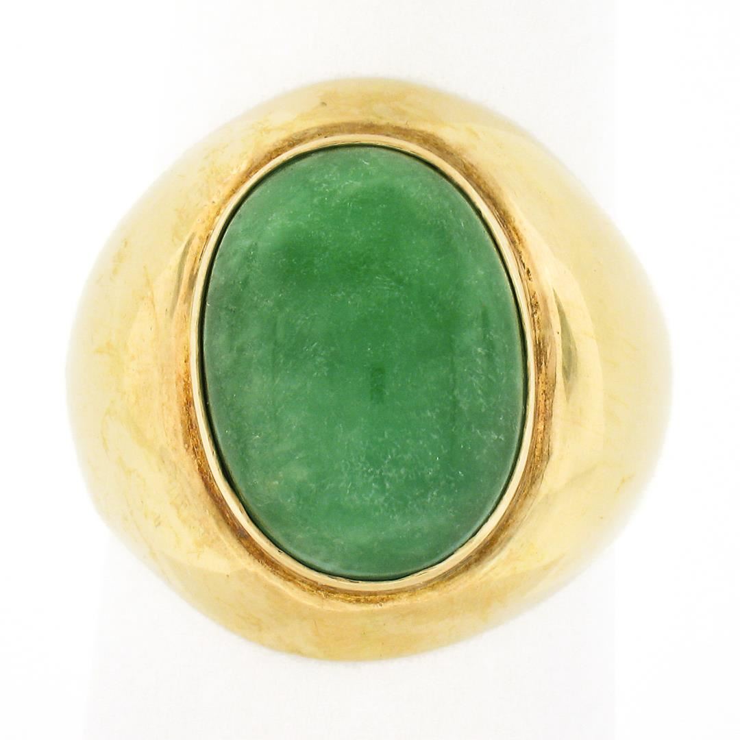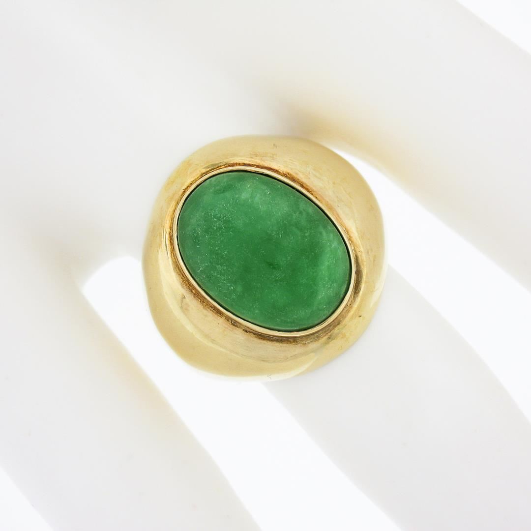 A vintage solid 14k yellow gold wide band ring, with 1 oval cabochon cut natural jade (14.1x10.3mm). The ring is size 6.5, weighs a total of 8.16 grams, and measures 19.2mm wide.