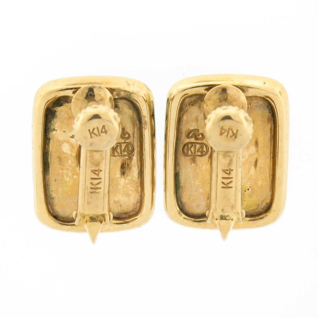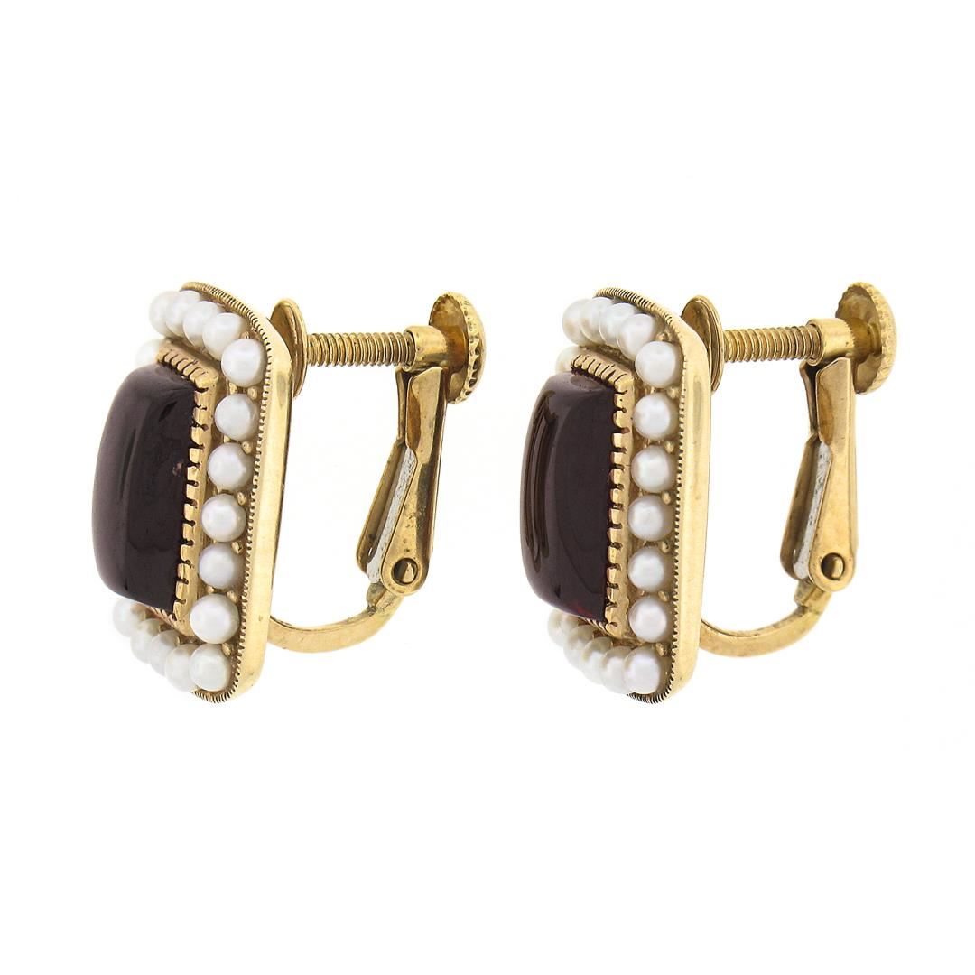a vintage solid 14k yellow gold earrings, with 2 rectangular cabochon cut natural garnets (9x4.7mm each), and a halo of numerous cultured seed pearls (1.8mm each). The earrings measure approximately 14.85x11.1mm and weigh a total of 6.45 grams.
