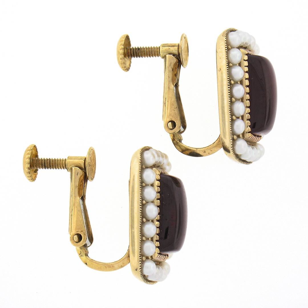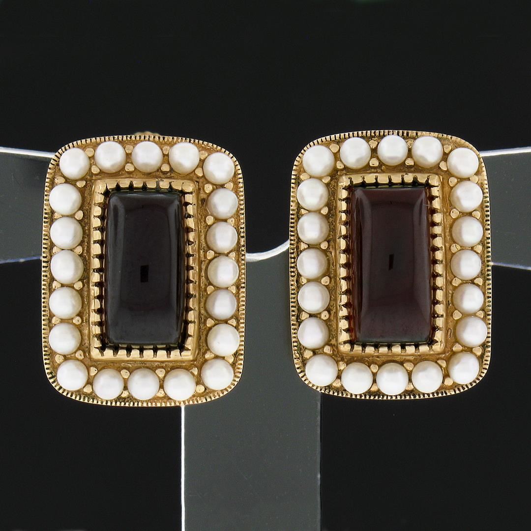 a vintage solid 14k yellow gold earrings, with 2 rectangular cabochon cut natural garnets (9x4.7mm each), and a halo of numerous cultured seed pearls (1.8mm each). The earrings measure approximately 14.85x11.1mm and weigh a total of 6.45 grams.