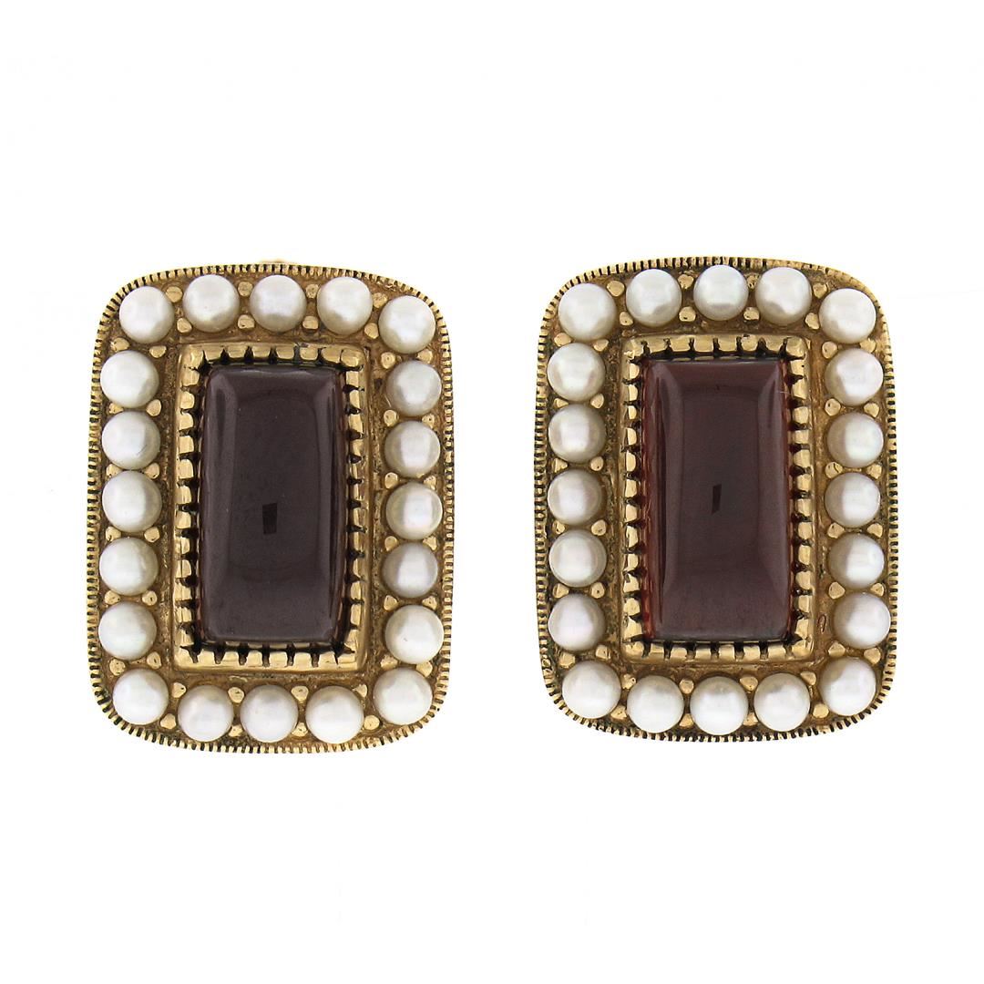 a vintage solid 14k yellow gold earrings, with 2 rectangular cabochon cut natural garnets (9x4.7mm each), and a halo of numerous cultured seed pearls (1.8mm each). The earrings measure approximately 14.85x11.1mm and weigh a total of 6.45 grams.