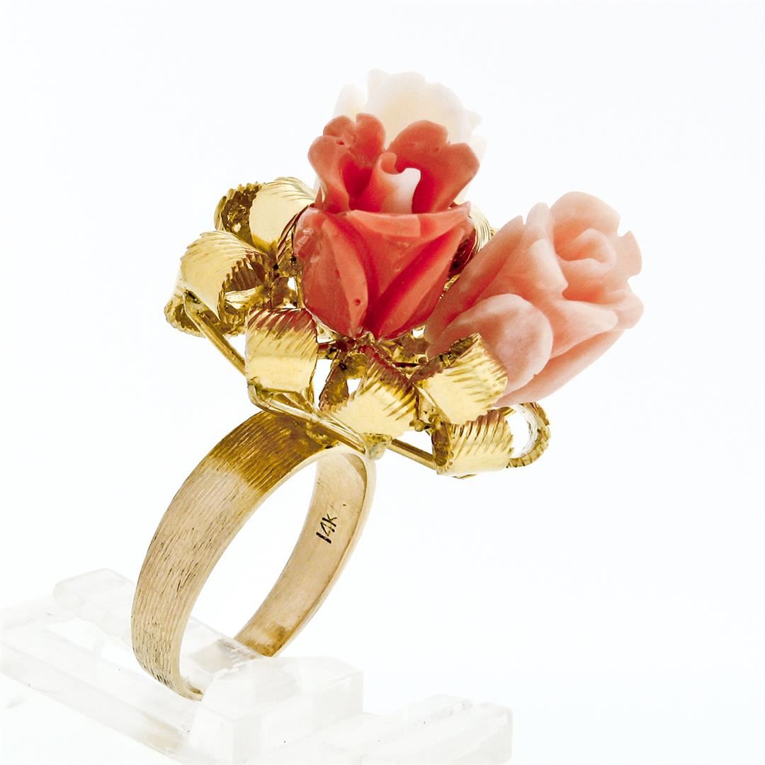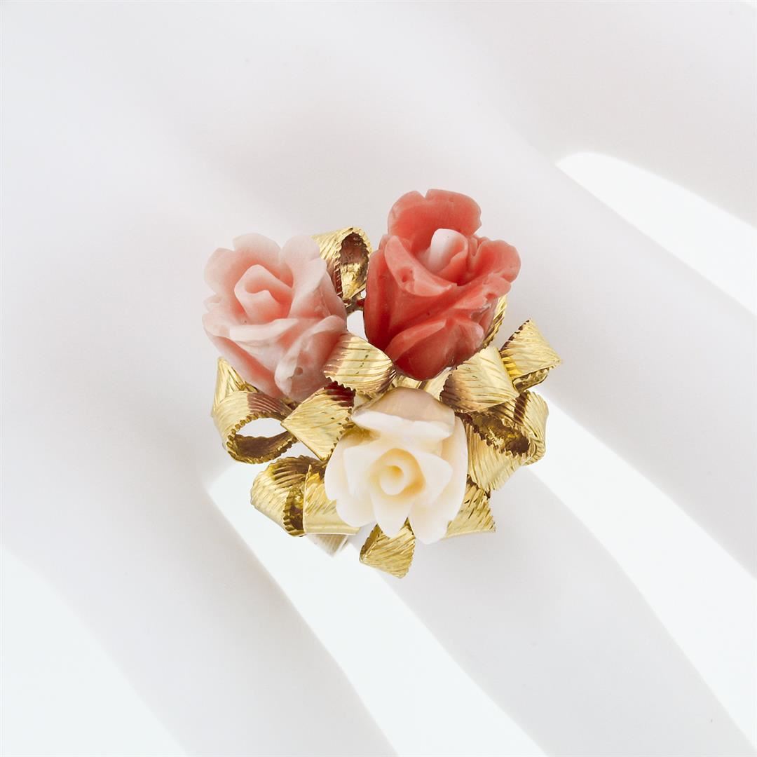 A vintage solid 14k yellow gold flower bouquet ribbon cocktail ring, with 3 carved rose flower shape natural coral. The ring is size 7, weighs a total of 12.52 grams, and measures 25.7mm wide.