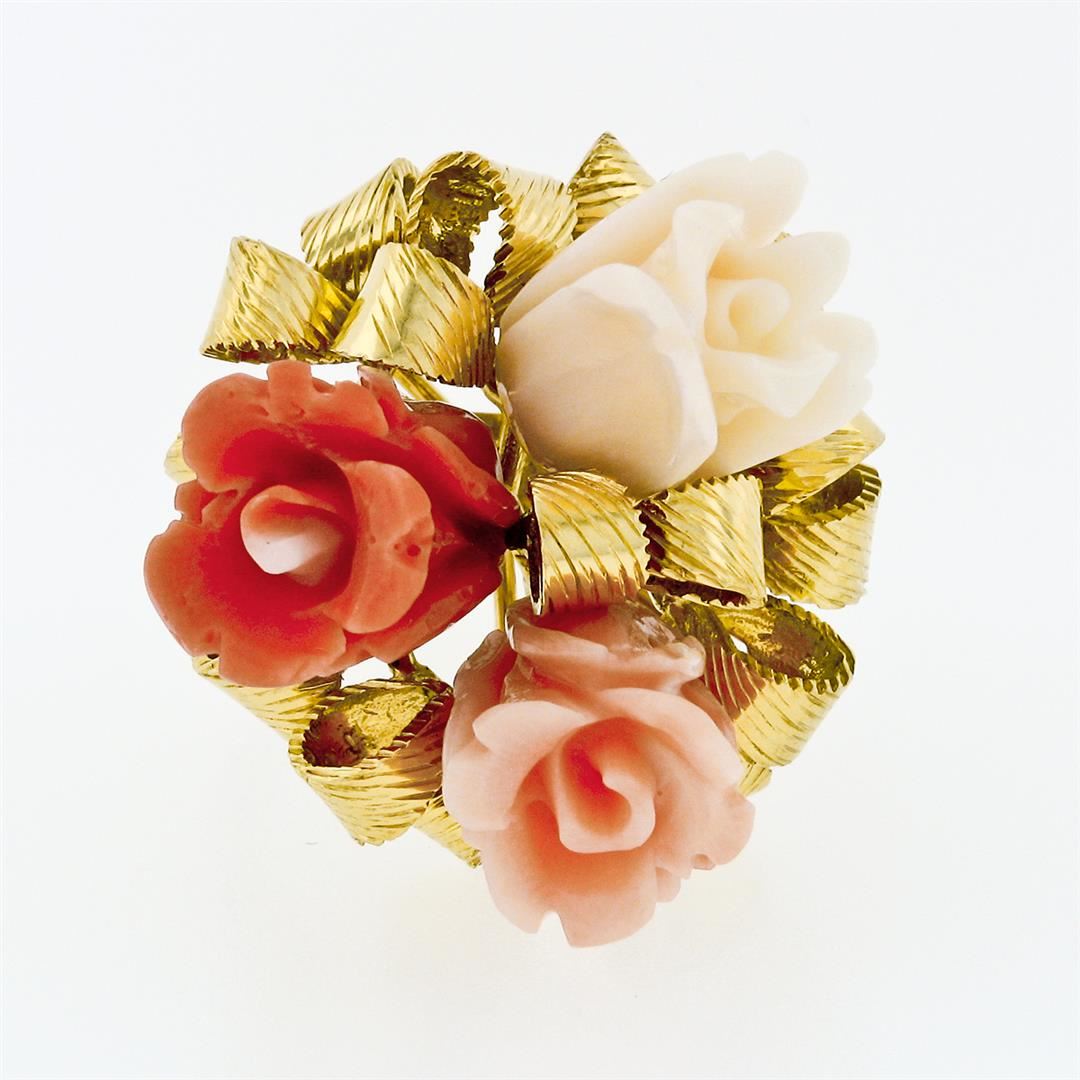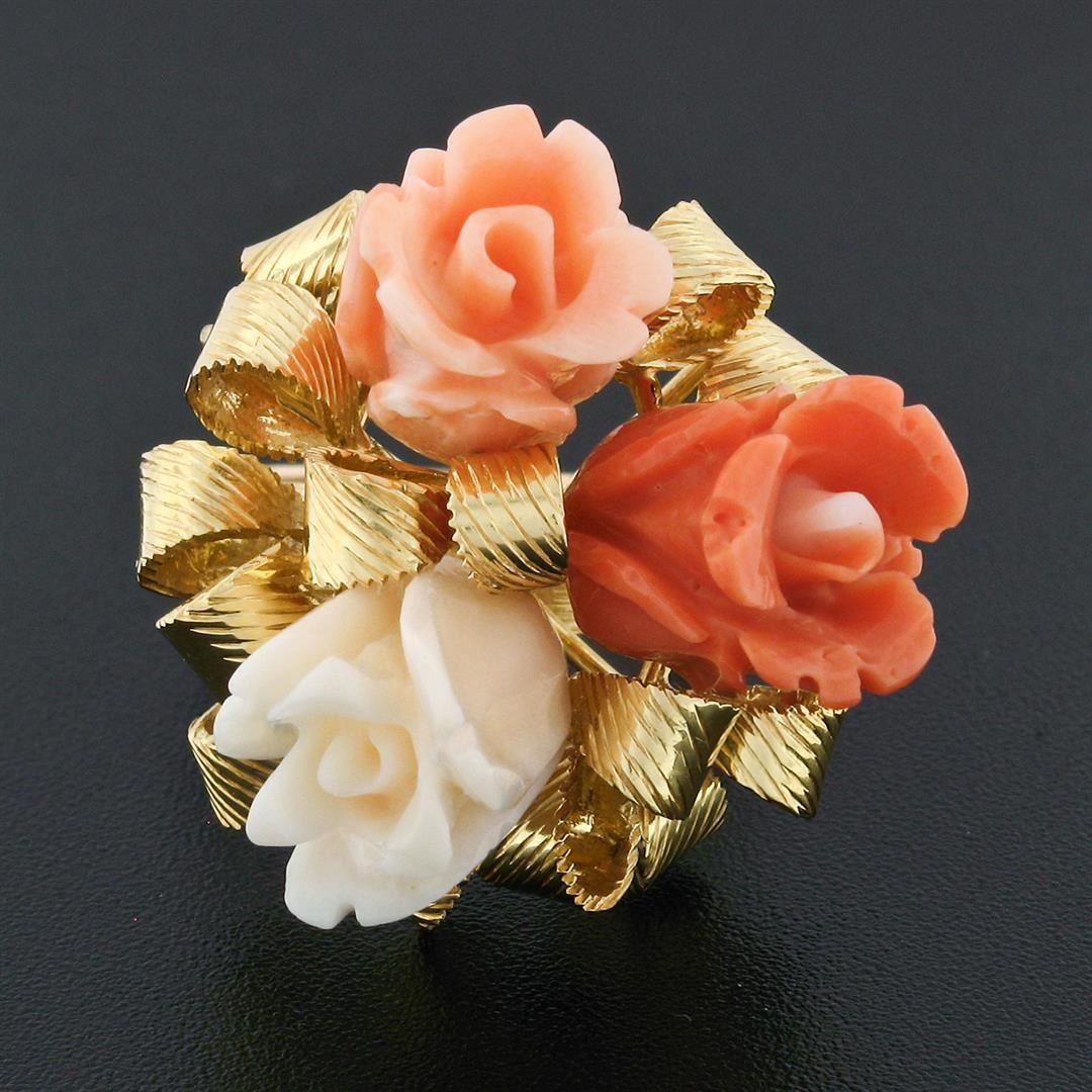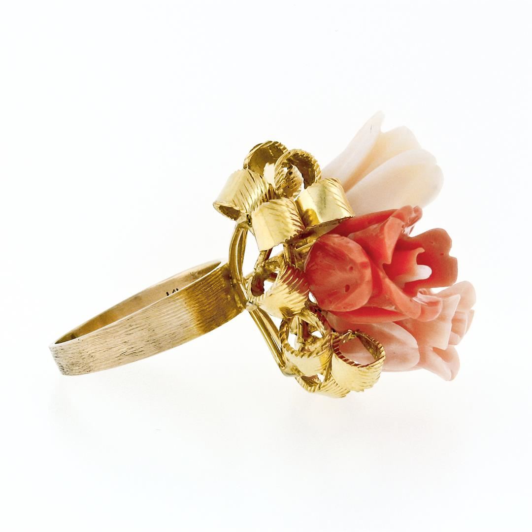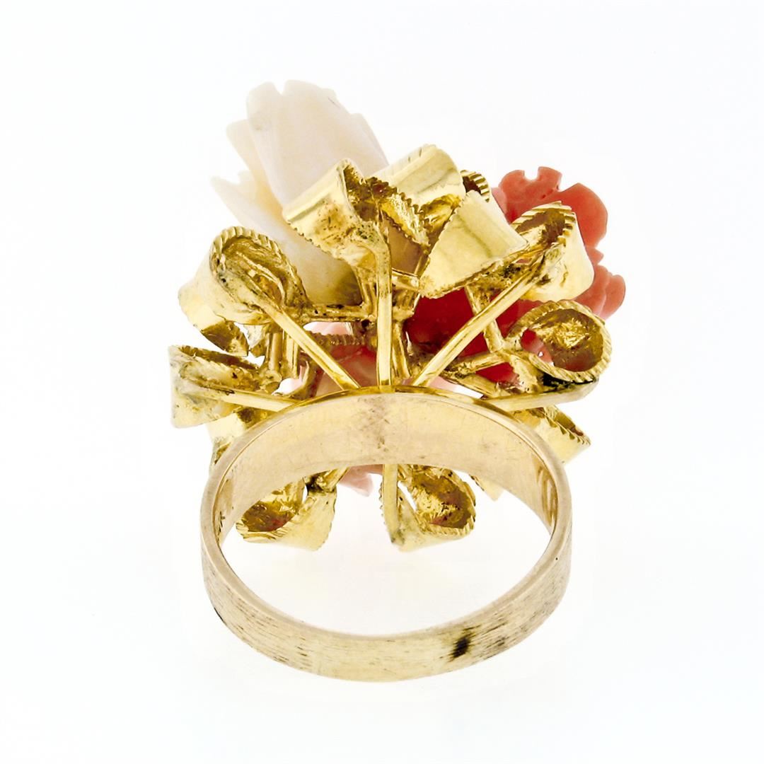 A vintage solid 14k yellow gold flower bouquet ribbon cocktail ring, with 3 carved rose flower shape natural coral. The ring is size 7, weighs a total of 12.52 grams, and measures 25.7mm wide.