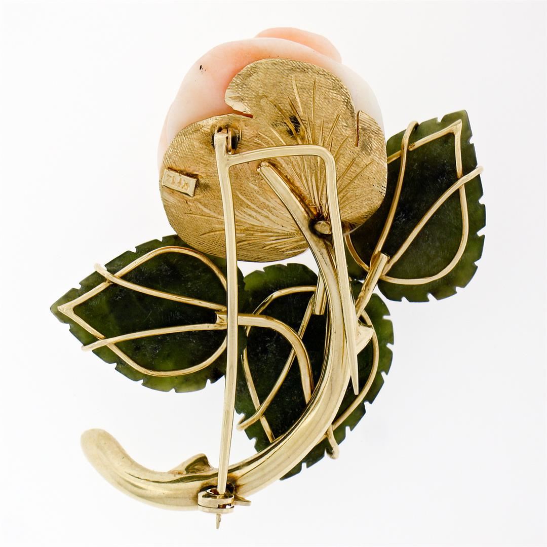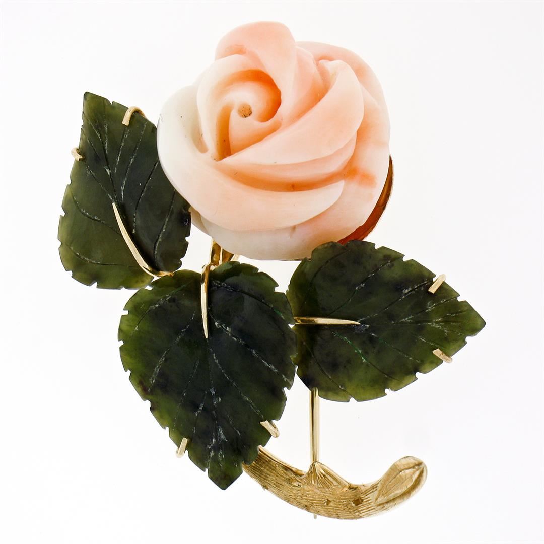Vintage 14K Yellow Gold Carved Pink Coral Rose Flower w/ 3 Jade Leaf Brooch Pin. Please see photos and description for all available information. A vintage solid 14k yellow gold flower pin brooch, with 1 carved rose shape natural coral (22.5x20.6mm), and