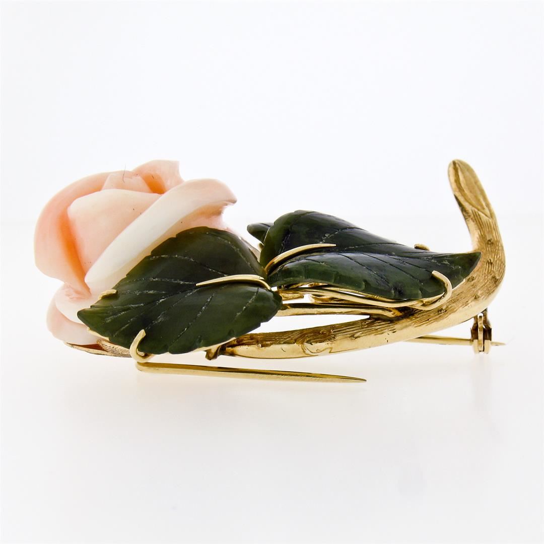 Vintage 14K Yellow Gold Carved Pink Coral Rose Flower w/ 3 Jade Leaf Brooch Pin. Please see photos and description for all available information. A vintage solid 14k yellow gold flower pin brooch, with 1 carved rose shape natural coral (22.5x20.6mm), and 3 carved leaf shape natural jade (16.2x18.7mm). Measures 39.6x43.5mm and weighs a total of 18.57 grams.