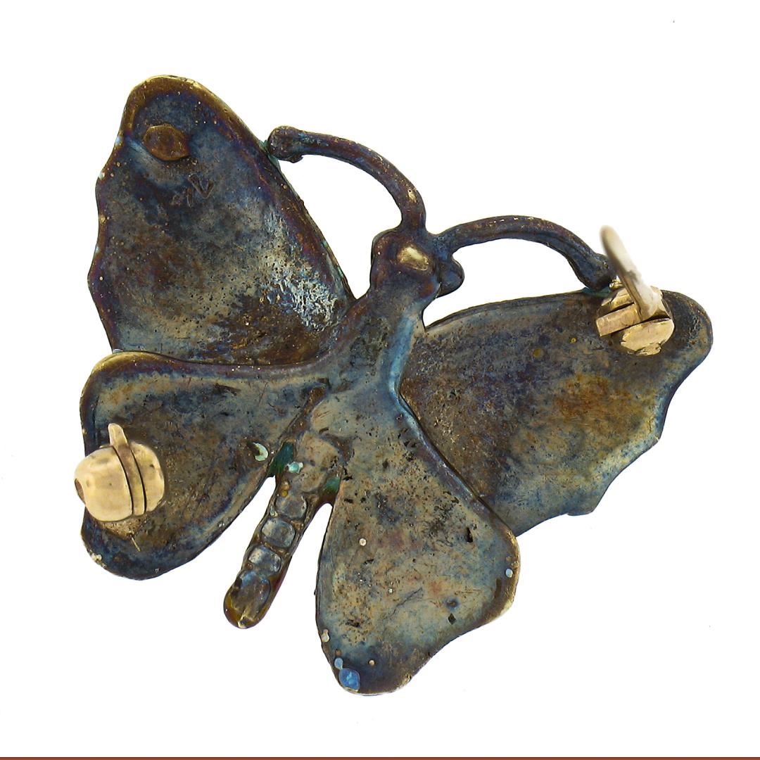 A vintage solid 14k yellow gold & colorful enamel work butterfly brooch. Measures 18.7x23.7mm and weighs a total of 4.1 grams.