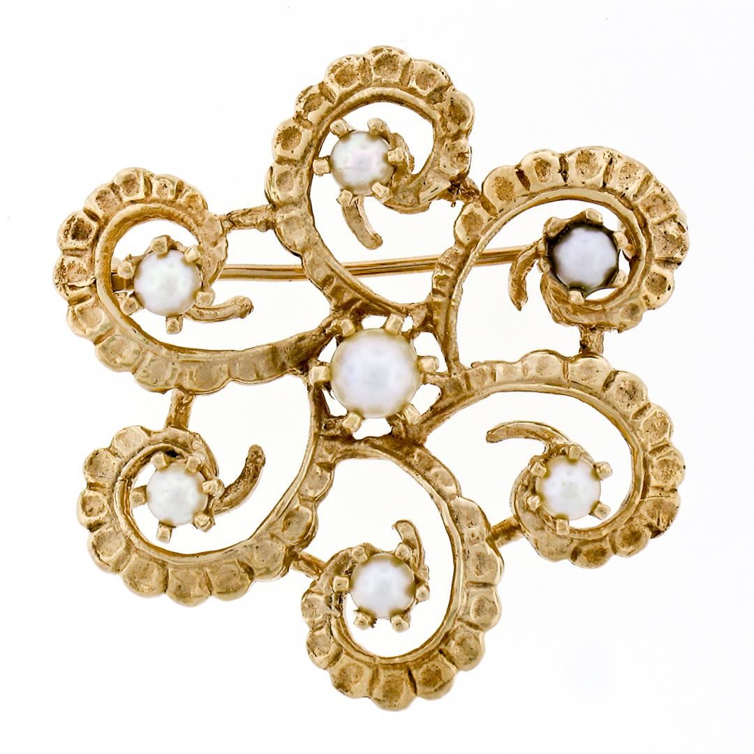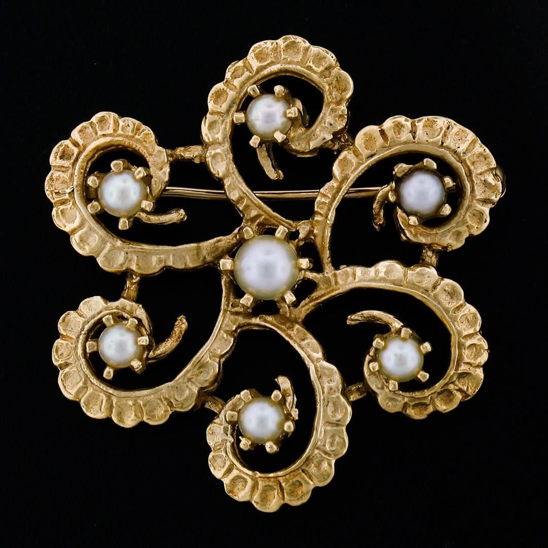 A vintage 14k yellow gold open work pin brooch, featuring 7 round shape natural cultured pearls (4.10mm (center pearl), (2.95-3.20mm outer pearls)). Measures 30.45mm in diameter and weighs a total of 7.75 grams.