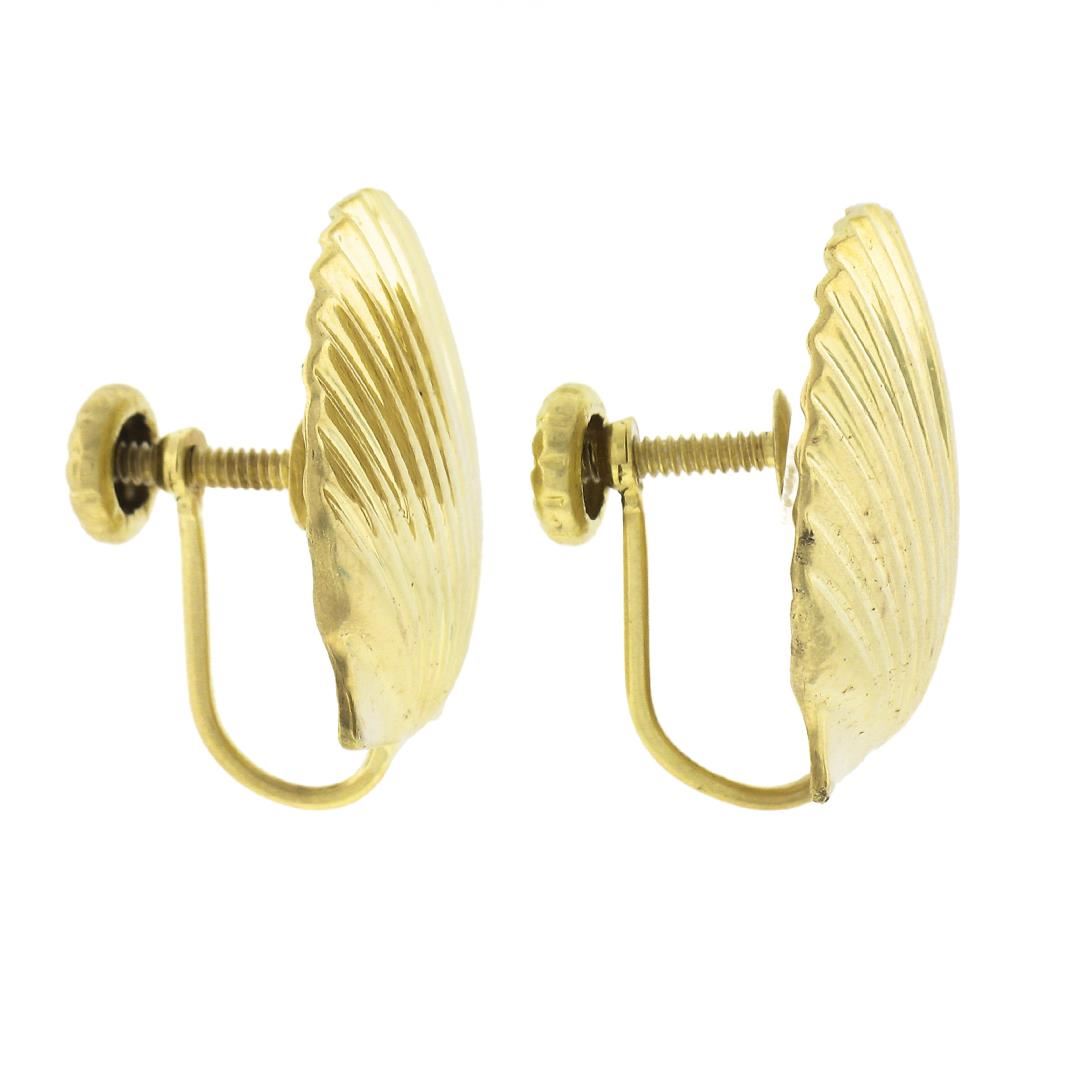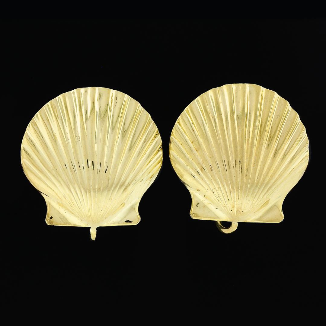 A vintage solid 14k yellow gold shell earrings. The earrings measure approximately 18.9x19.3mm and weigh a total of 5.58 grams.