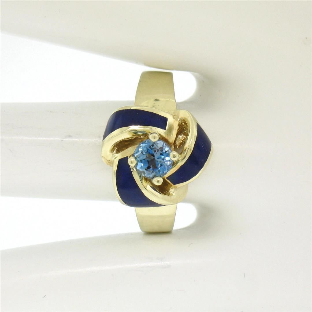 Vintage 14K Yellow Gold FINE Aquamarine & Blue Enamel Trinity Knot Cocktail Ring. Please see photos and description for all available information. A vintage solid 14k yellow gold knot ring, with blue enamel work and 1 round brilliant cut natural aquamarine (0.56ct). The ring is size 8.0, weighs a total of 10.28 grams, and measures 14.75mm wide.