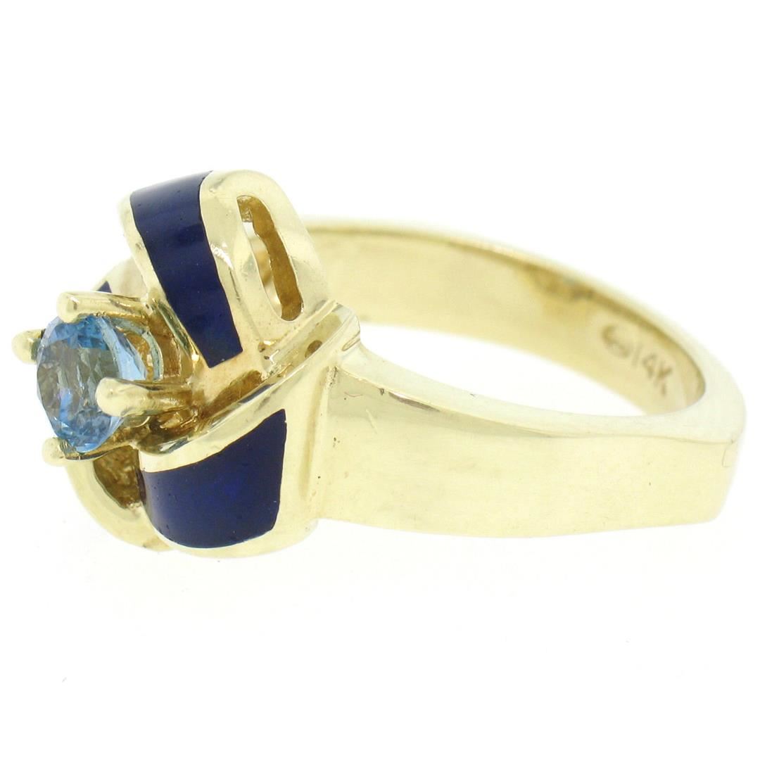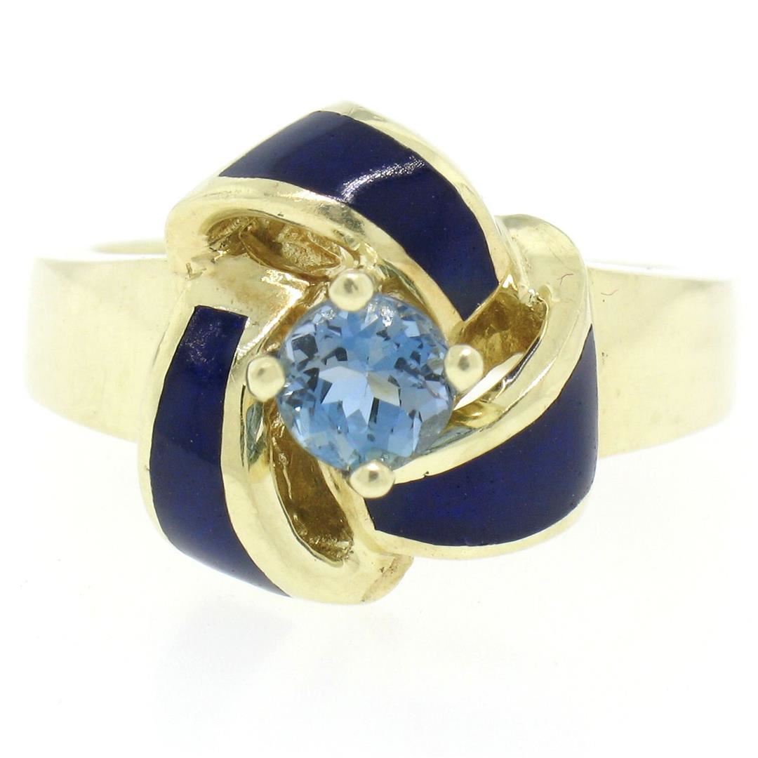 Vintage 14K Yellow Gold FINE Aquamarine & Blue Enamel Trinity Knot Cocktail Ring. Please see photos and description for all available information. A vintage solid 14k yellow gold knot ring, with blue enamel work and 1 round brilliant cut natural aquamarine (0.56ct). The ring is size 8.0, weighs a total of 10.28 grams, and measures 14.75mm wide.
