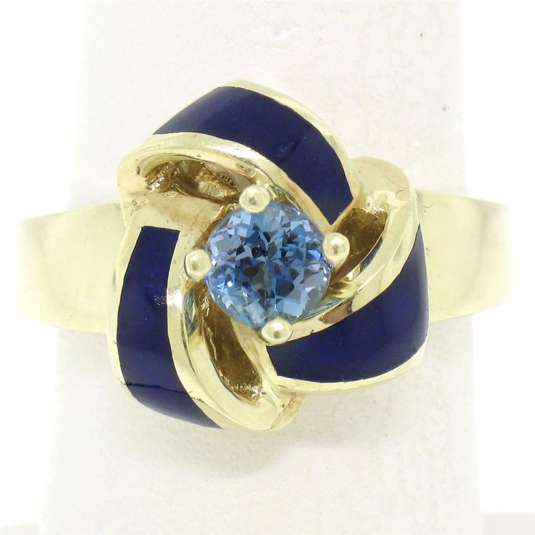 Vintage 14K Yellow Gold FINE Aquamarine & Blue Enamel Trinity Knot Cocktail Ring. Please see photos and description for all available information. A vintage solid 14k yellow gold knot ring, with blue enamel work and 1 round brilliant cut natural aquamarine (0.56ct). The ring is size 8.0, weighs a total of 10.28 grams, and measures 14.75mm wide.